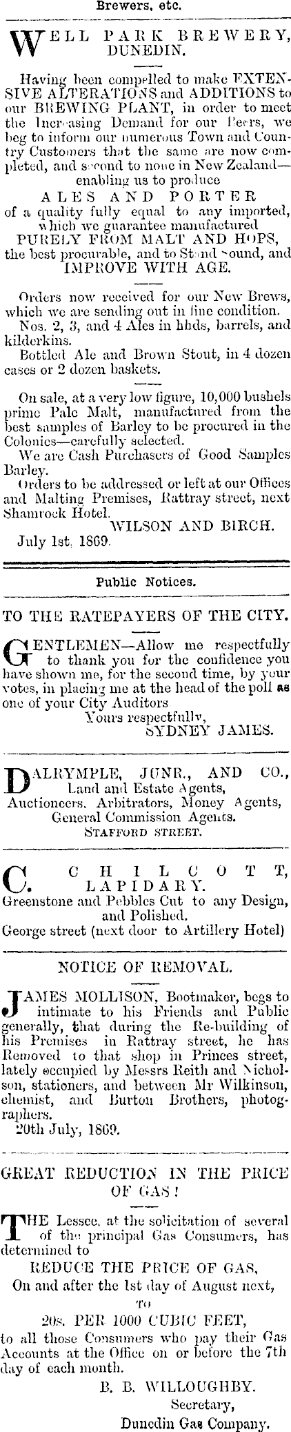 Brewers, etc. WELL PA R K BREWER Y, DUNEDIN. Having been compelled to make EXTENSIVE ALTERATIONS and ADDITIONS to our BREWING PLANT, in order to meet the Increasing Demand for our Reel’s, we beg to inform our numerous Town and Country Customers that the same are now completed, and second to none in New Zealand — enabling us to produce ALES AND PORTER of a quality fully equal to any imported, which wc guarantee manufactured PURELY FROM MALT AND HOPS, the best procurable, and to Stand ■■bund, and IMPROVE WITH AGE. Orders now received for our New Brews, which wc are sending out in line condition. Nos. 2, 3, and 4 Ales in hhds, barrels, and kilderkins. Bottled Ale and Brown Stout, in 4 dozen cases or 2 dozen baskets. On sale, at a very low figure, 10,000 bushels prime Pale Malt, manufactured from the best samples of Barley to be procured in the Colonics—carefully selected. We arc Cash Purchasers of Good Samples Barley. Orders to be addressed or left at our Offices and Malting Premises, Rattray street, next Shamrock Hotel. WILSON AND BIRCH. July Ist, 1869. Public Notices. TO THL RATEPAYERS OF THE CITY. GENTLEMEN— Allow me respectfully to thank you for the confidence you have shown me, for the second time, by your votes, in placing me at the head of the poll rb one of your City Auditors Yours respectfullv, SYDNEY J AMES. DALRYMPLE, JUNE., AND CO., Land and Estate Agents, Auctioneers. Arbitrators, Money Agents, General Commission Agents. Stafford street. CGHILCOTT, . LAPIDARY. Greenstone and Pebbles Cut to any Design, and Polished. George street (next door to Artillery Hotel) NOTICE OF REMOVAL. JAMES MOLLTSON, Bootmaker, bogs to intimate to his Friends and Public generally, that during the Re-building of Iris Premises in Rattray street, he has Removed to that shop in Princes street, lately occupied by Messrs Keith and Nicholson, stationers, and between Mr Wilkinson, chemist, and Burton Brothers, photographers. 20th July, 1809. GREAT REDUCTION IN THE PRICE OF GAS 1 THE Lessee, at the solicitation of several of the principal Gas Consumers, has determined to REDUCE THE PRICE OF GAS, On and after the Ist day of August next, To 20s. PER 1000 CUBIC FEET, to all those Consumers who pay their Gas Accounts at the Office on or before the 7th day of each month. B. B. WILLOUGHBY. Secretary, Dunedin Ga« Company.
