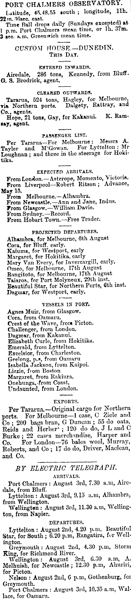 PORT CHALMERS OBSERVATORY. Latitude, 45.48.55 south ; longitude, llh. 32 m. afisec. east. ..... Time Ball drops daily (Sundays excepted) at 1 p.m. Port Chalmers mean time, or Ih, 37m. 3 sec. ».m, Greenwich mean time. CUSTOM HOUSE.—DUNEDIN, This Dat. ENTERED INWARDS, Airedale, 286 tons, Kennedy, from Bluff. O. S. Brodrick, agent, CLEARED OUTWARDS, Tararua, 524 tons, Hagley, for Melbourne, via Northern ports. Dalgety, Rattray, and Co., agents. . Hope, 21 tons, Gay, for Kakanm. K. Ramsay, agent. PASSENGER LIST. Per Tararua—For Melbourne ; Messrs A. Tayler and M'Go-wan. For Lyttelton: Mr Loughnan; and three in the steerage for Hokitika. EXPECTED ARRIVALS, From London. —Asterope, Momento, \ ictoria. From Liverpool—Robert Ritson ; Advance, May 15. From Melbourne.—Alhambra. From Newcastle. —Ann and Jane, Indus, From Glasgow.—"William Davie. From Sydney.—Record. From Hobart Town.—Free Trader. PROJECTED DEPARTURES. Alhambra, for Melbourne, Oth August Cora, for Bluff, early. Kahuna, for Westport, early Margaret, for Hokitika, early Mary Van Every, for Invercargill, early. Omeo, for Melbourne, 17th August Rangitoto, for Melbourne, 17th August Taiaroa, for Port Molyneux, 29ih inst. Beautiful Star, for Northern Ports, Oth inst, Dagmar, for Westport, early. VESSELS IN PORT. Agnes Muir, from Glasgow. Cora, from Oam aru. Crest of the Wave, from Picton. Challenger, from London. Dagmar, from Kakanui. Elizabeth Curie, from Hokitika. Emerald, from Lyttelton. Excelsior, from Charleston. Geelong, p.s, from Oamaru Isabella Jackson, from Kaipoi. Lizzie, from Boston Margaret, from Rakiura. Onehunga,-from Coast. Undaunted, from London. EXPORTS. Per Tararua. —Original cargo for Northern ports. For Melbourne —1 case, C Ziele and Co ; 200 bags bran, G Duncan ; 55 do oats, Reids and Herber 1- ; 120 do do, J L and C Burke; 22 cases merchandise. Harper and Co. For London—76 bales wool, Murray, Roberts, and Co ; 17 do do, Driver, Maclean, and Co. BY ELECTBIC TELEGRAPH. ARRIVALS. Port Chalmers ; August 3rd, 7.30 a.m, Airedale, from Bluff. Lyttelton: August 3rd, 9.15 a. in, Alhambra, from Wellington. Wellington: August 3rd, 11.30 a.m, Wellington, from Napier. DEPARTURES. Lyttelton : August 2nd, 4.20 p.m, Beautiful Star, for South ; 6.20 p.m, Rangatira, fur Wellington. Greymouth : August 2nd, 4,30 p.m, Storm King, for Richmond River. Wellington: August 3rd, 6.30 a.m, A. Melhuish, for Newcastle; 12.30 p.m, Ahuriri, for Picton, Nelson : August 2nd, G p.m, Gothenburg, for Greymouth. Port Chalmers : August 3rd, 10,35 a.m, Wallace, for Oamaru.