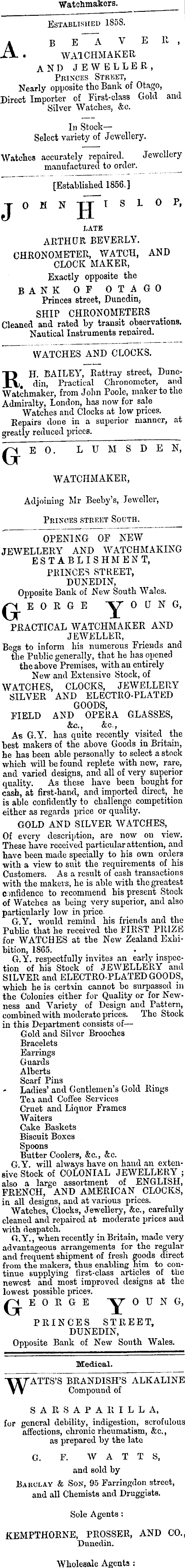 Watchmakers. Established 185 S. AB E A V E 11 , • WAI OHM AKER AND JEWELLER, Princes Street, Nearly opposite the Bank of Otago, Direct Importer of First-class Gold and Silver Watches, &c. In Stock — Select variety of Jewellery. Watches accurately repaired. Jewellery manufactured to order. [Established 1856.] JOHN JJ I S L 0 P, LATE ARTHUR BEVERLY. CHRONOMETER, WATCH, AND CLOCK MAKER, Exactly opposite the BANK OF OTAGO Princes street, Dunedin, SHIP CHRONOMETERS Cleaned and rated by transit observations. Nautical Instruments repaired. WATCHES AND CLOCKS. RH. BAILEY, Rattray street, Dune- # din, Practical Chronometer, and Watchmaker, from John Poole, maker to the Admiralty, London, has now for sale Watches and Clocks at low prices. Repairs done in a superior manner, at greatly reduced prices. E 0. L U M S D E N, WATCHMAKER, Adjoining Mr Beeby’s, Jeweller, Princes street South. OPENING OF NEW JEWELLERY AND WATCHMAKING ESTABLISHMENT, PRINCES STREET, DUNEDIN, Opposite Bank of New South Wales. G EOR G E Y° U N G, PRACTICAL WATCHMAKER AND JEWELLER, Begs to inform his numerous Friends and the Public generally, that he has opened the above Premises, with an entirely New and Extensive Stock, of WATCHES, CLOCKS, JEWELLERY SILVER AND ELECTRO-PLATED GOODS, FIELD AND OPERA GLASSES, &c., &c., As G.Y. has quite recently visited the best makers of the above Goods in Britain, he has been able personally to select a stock which will be found replete with new, rare, and varied designs, and all of very superior quality. As these have been bought for cash, at first-hand, and imported direct, he is able confidently to challenge competition either as regards price or quality. GOLD AND SILVER WATCHES, Of every description, are now on view. These have received particular attention, and have been made specially to his own orders with a view to suit the requirements of his Customers. As a result of cash transactions with the makers, he is able with the greatest confidence to recommend his present Stock of Watches as being very superior, and also particularly low in price. G.Y. would remind his friends and the Public that he received the FIRST PRIZE for WATCHES at the New Zealand Exhibition, 1865. G.Y. respectfully invites an early inspection of his Stock of JEWELLERY and SILVER and ELECTRO-PLATED GOODS, which he is certain cannot be surpassed in the Colonies either for Quality or for Newness and Variety of Design and Pattern, combined with moderate prices. The Stock in this Department consists of— Gold and Silver Brooches Bracelets Earrings Guards Alberts Scarf Pins - Ladies’ and Gentlemen’s Gold Rings Tea and Coffee Services Cruet and Liquor Frames Waiters Cake Baskets Biscuit Boxes Spoons Butter Coolers, &c., &c. G.Y. will always have on hand an extensive Stock of COLONIAL JEWELLERY ; also a large assortment of ENGLISH, FRENCH, AND AMERICAN CLOCKS, in all designs, and at various prices. Watches, Clocks, Jewellery, &c., carefully cleaned and repaired at moderate prices and with despatch. G.Y., when recently in Britain, made very advantageous arrangements for the regular and frequent shipment of fresh goods direct from the makers, thus enabling him to continue supplying first-class articles of the newest and most improved designs at the lowest possible prices. G EOR G E Y 0 U N G, PRINCES STREET, DUNEDIN, Opposite Bank of New South Wales. Medical. WATTS’S BRANDISH’S ALKALINE Compound of SARSAPARILLA, for general debility, indigestion, scrofulous affections, chronic rheumatism, &c., as prepared by the late G. F. WATT S, and sold by Barclay & Son, 95 Farringdon street, and all Chemists and Druggists. Sole Agents: KEMPTHORNE, PROSSER, AND CO., Dunedin. Wholesale Agents :