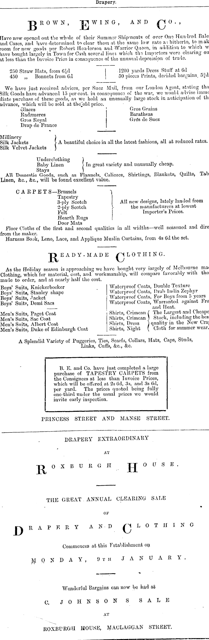 Drapery. B SOWN, Jgj W 1 N G , AND 0 . , Have now opened out the whole of their Summer Shipments of over One Huudied Bales and Cases, and have determined to clear them at the same low rate a; hitherto, to mak room for new goods per Robert Henderson and Warrior Queen, in addition to which whave bought largely in Town for Cash several lines which the Importers were clearing on at less than the Invoice Price in consequence of the unusual depression of trade. 250 Strasv Hats, from 450 ~ Bonnets from 6d 50 pieces Prints, decided bargains, 5;, ! d We have just received advices, per Suez Mail, from our London Agent, stating tha Silk Goods have advanced 15 percent, in consequence of the war, we would advise inline diate purchase of these goods, as wc hold an unusually large stock in anticipation of thi advance, which will be sold at thc'jold price. Glaces Gros Grains Radzmeres Gros Royal Drap de France Baratheas Gr<ss de Suez Millinery Silk Jackets Silk Velvet Jackets A beautiful choice in all the latest fashions, all at reduced rates. Underclothing ) Baby Linen > In great variety and unusually cheap. Stays ) All Domestic Goods, such as Flannels, Calicoes, Shirtings, Blankets, Quilts, Tab] Linen, &c., &c., will be found excellent value. CARPET S—Brussels Tapestry 3-ply Scotch 2-ply Scotch Felt Hearth Rugs d | All new designs, lately landed from J- the manufacturers at lowest I Importer’s Prices. Door Mats Floor Cloths of the first and second qualities in all widths —well seasoned and dire from the maker. Harness Book, Leno, Lace, and Applique Muslin Curtains, from 4s Gdthe set. EADY- M A D E QLOTHING. As the Holiday season is approaching we have bought very largely of Melbourne mac Clothing, which for material, cost, and workmanship, will compare favorably with thoi made to order, and at nearly half the cost. Boys’ Suits, Knickerbocker Boys’ Suita, Stanley shape Boys’ Suits, Jacket Boys’ Suits, Demi Sacs Men’s Suits, Paget Coat Men’s Suits, Sac Coat Men’s Suits, Albert Coat Men’s Suits, Duke of Edinburgh Coat Waterproof Coats, Double Texture Waterproof Coats, Drab India Zephyr "Waterproof Coats, For Boys from 5 years Waterproof Coats, Warranted against Iro and Heat. j Shirts, Crimean { The Largest and Cheape I Shirts, Crimean j Stock, including the besl I Shirts, Dress 1 quality in the New Craj 1 Shirts, Night ( Cloth for summer wear. A Splendid Variety of Puggeries, Ties, Scarfs, Collars, Hats, Caps, Studs, Links, Cuffs, &c., &c. B. E. and Co. have just completed a large purchase of TAPESTRY CARPETS from the Consignees at less than Invoice Prices, which will be offered at 2s Gd, 3s, and 3s Gd, per yard. The prices quoted being fully one-third under the usual prices we would invite early inspection. PRINCESS STREET AND MANSE STREET. DRAPERY EXTRAORDINARY AT OXBURG II O U S 1 THE GREAT ANNUAL CLEARING SALE ov RAP FRY AND Commences at this Establishment op MONDAY, 9th JANUARY. Wonderful Bargains can now be had at C. JOHNSON S SALE AT ROXBURGH HOUSE, AJACLAGGAN STREET.