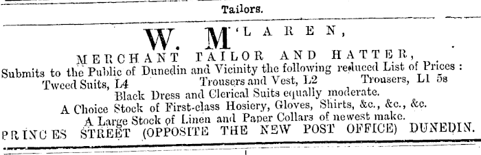 w. merchant Tailors, iy|' ‘ L A R E N , TAILOR AND HATTER, Submits to the Public of Dunedin and Vicinity the following reduced List of I rices : Tweed Suits, L 4 Trousers and Vest, L2 Trousers, LI os Black Dress and Clerical Suits equally moderate. A Choice Stock of First-class Hosiery, Cxloves, Shirts, &c., &c., &c. A Dartre Stock of Linen and Paper Collars of newest make. PRINCES STREET (OPHITE THE NSW POST OFFICE) DUNEPIN.