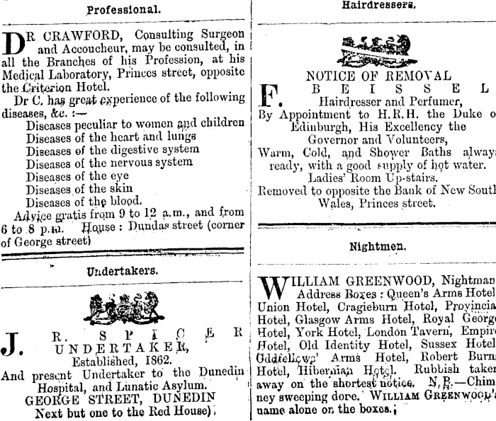 Professional. DR CRAWFORD, Consulting Surgeon and Accoucheur, may be consulted, in all the Branches of his Profession, at his Medical Laboratory, Princes street, opposite the Criterion Hotel. . Dr C. has great experience of the following diseases, &c. Diseases peculiar to women a,ud children Diseases of the heart and lungs Diseases of the digestive system Diseases of the nervous system Diseases of the eye Diseases of the skin Diseases of thp blopd. A4-WG gratis frqm 9 to 12 a.m., and ijrom 6 to 8 p.fei. : Dundas street (comer of George street) I F. By Appoi Edi ( Warm, C ready, > ] Removed