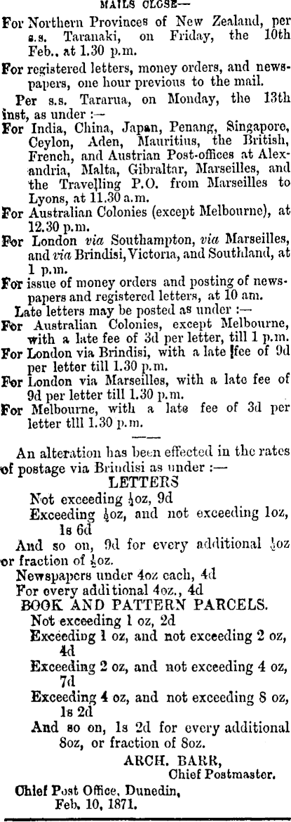 MAILS CLOSE— For Northern Provinces of New Zealand, per B.s. Taranaki, on Friday, the 10 th Feb., at 1.30 p.m. For registered letters, money orders, and newspapers, one hour previous to the mail. Per s.s. Tarama, on Monday, the 13th inst, as under For India, China, Japan, Penang, Singapore, Ceylon, Aden, Mauritius, the British, French, and Austrian Post-offices at Alexandria, Malta, Gibraltar, Marseilles, and the Travelling P.O. from Marseilles to Lyons, at 11.30 a.m. For Australian Colonies (except Melbourne), at 12.30 p.m. For London via Southampton, via Marseilles, and via Brindisi, Victoria, and Southland, at 1 p.m. For issue of money orders and posting of newspapers and registered letters, at 10 am. Late letters may be posted as under For Australian Colonies, except Melbourne, with a late fee of 3d per letter, till 1 p.m. For London via Brindisi, with a late Jfee of 9d per letter till 1.30 p.m. For London via Marseilles, with a late fee of 9d per letter till 1.30 p.m. For Melbourne, with a late fee of 3d per letter till 1.30 p.m. An alteration has been effected in the rates of postage via Brindisi as tinder : LETTERS Not exceeding ioz, 9d Exceeding \oz t and not exceeding loz, Is 6d And so on, 9d for every additional ioz or fraction of ioz. Newspapers under 4oz each, 4d For every additional 40z., 4d BOOK AND PATTERN PARCELS. Not exceeding 1 oz, 2d Exceeding 1 oz, and not exceeding 2 oz, 4d Exceeding 2 oz, and not exceeding 4 oz, 7d Exceeding 4 oz, and not exceeding 8 oz, Is 2d And so on, Is 2d for every additional Boz, or fraction of Boz. ARCH. BARK, Chief Postmaster. Chief Post Office, Dunedin, Feb. 10.1871.
