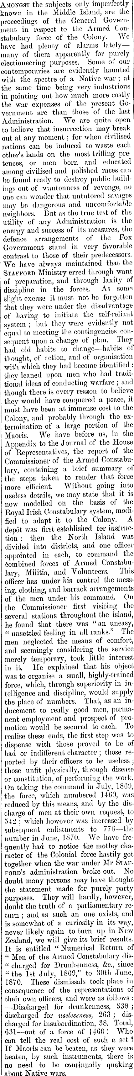 Amongst the subjects only imperfectly known in the Middle Island, are the proceedings of the General Government in respect to the Armed Constabulary force of the Colony. We have had plenty of alarms lately—many of them apparently for purely electioneering purposes. Some of our contemporaries are evidently haunted with the spectre of a Native war ; at the same time being very industrious in pointing out how much more costly the war expenses of the present Government are than those of the last Administration. We are quite open to believe that insurrection may break out at any moment; for when civilised nations can be induced to waste each other’s lands on the most trifling pretences, or men born and educated among civilised and polished races can be found ready to destroy public buildings out of wantonness of revenge, no one can wonder that untutored savages may bo dangerous and uncomfortable neighbors. But as the true test of the utility of any Administration is the energy and success of its measures, the defence arrangements of the Fox Government stand in very favorable contrast to those of their predecessors. We have always maintained that the Stafford Ministry erred through want of preparation, and through laxity of discipline in the forces. As some slight excuse it must not be forgotten that they were under the disadvantage of having to initiate the self-reliant system ; but they were evidently not equal to meeting the contingencies consequent upon a change of plan. They had old habits to change—habits of thought, of action, and of organisation with which they had become identified : they leaned upon men who had traditional ideas of conducting warfare ; and though there is every reason to believe they would have conquered a peace, it must have been at immense cost to the Colony, and probably through the extermination of a large portion of the Maoris. We have before us, in the Appendix to the Journal of the House of Representatives, the report of the Commissioner of the Armed Constabulary, containing a brief summary of the steps taken to render that force more efficient. Without going into useless details, we may state that it is now modelled on the basis of the Royal Irish Constabulary system, modified to adapt it to the Colony. A depot was first established for instruction ; then the North Island was divided into districts, and one officer appointed in each, to command the combined forces of Armed Constabulaiy, Militia, and Volunteers. This officer has under his control the messing, clothing, and barrack arrangements of the men under his command. On the Commissioner first visiting the several stations throughout the island, he found that there was “an uneasy, “ unsettled feeling in all ranks.” The men neglected the means of comfort, and seemingly considering the service merely temporary, took little interest in it. He explained that his object was to organise a small, highly-trained force, which, through superiority in intelligence and discipline, would supply the place of numbers. That, as an inducement to really good men, permanent employment and prospect of promotion would be secured to each. To realise these ends, the first step was to dispense with those proved to be of bad or indifferent character; those reported by their officers to be useless; those unfit physically, through disease or constitution, of performing the work. On taking the command in July, 18(59, the force, which numbered 1460, was reduced by this means, and by the discharge of men at their own request, to 542 ; which however was increased by subsequent enlistments to 77G—the number in June, 1870. We have frequently had to notice the motley character of the Colonial force hastily got together when the war under Mr Stafford’s administration broke out. No doubt many persons may have thought the statement made for purely party purposes. They will hardly, however, doubt the truth of a parliamentary return ; and as such an one exists, and is somewhat of a curiosity in its way, never likely again to turn up in New Zealand, we will give its brief results. It is entitled “Numerical Return of “ Men of the Armed Constabulary dis- “ charged for Drunkenness, Arc., since “ the Ist July, 1869,” to 30th June, 1870, These dismissals took place in consequence of the representations of their own officers, and were as follows : —Discharged for drunkenness, 330 ; discharged for uselessness, 263 ; discharged for insubordination, 38, Total, 631—out of a force of 1460 ! Who can tell the real cost of such a set 1 If Maoris can be beaten, as they were beaten, by such instruments, there is no need to be continually quaking about Native wars.