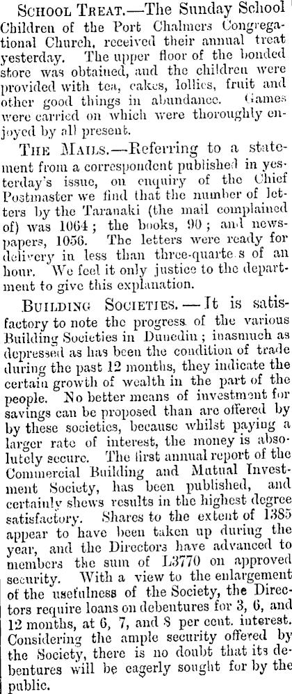 School Treat.— The Sunday School Children of the Port Chalmers Congregational Church, received their annual treat yesterday. The upper floor of the bonded store was obtained, and the children were provided with tea, cakes, lollies, fruit and other good things in abundance. Carnes were carried on which were thoroughly enjoyed by all present. The Mails.—Referring to a statement from a correspondent published in yesterday’s issue, on enquiry of the Chief Postmaster we find that the number of letters by the Taranaki (the mail complained of) was 10G4; the books, DO ; and newspapers, 1058. The letters were ready for delivery in less than three-quarte s of an hour. We feel it only justice to the department to give this explanation. Building Societies. —lt is satisfactory to note the progress, of the various Building Societies in Dunedin ; inasmuch as depressed as has been the condition of trade during the past 12 mouths, they indicate the certain growth of wealth in the paid of the people. Ro better means of investment for savings can be proposed than arc offered by by these societies, because whilst paying a larger rate of interest, the money is absolutely secure. The first annual report of the Commercial Building and Mutual Investment Society, has been published, and certainly shews results in the highest degree satisfactory. Shares to the extent of 1385 appear to have been taken up during the year, and the Directors have advanced to members the sum of L 3770 on approved security. With a view to the enlargement of the usefulness of the Society, the Directors require loans on debentures for 3, 8, and 12 months, at 6, 7, and S per cent, interest. Considering the ample security offered by the Society, there is no doubt that its debentures will be eagerly sought for by the public.