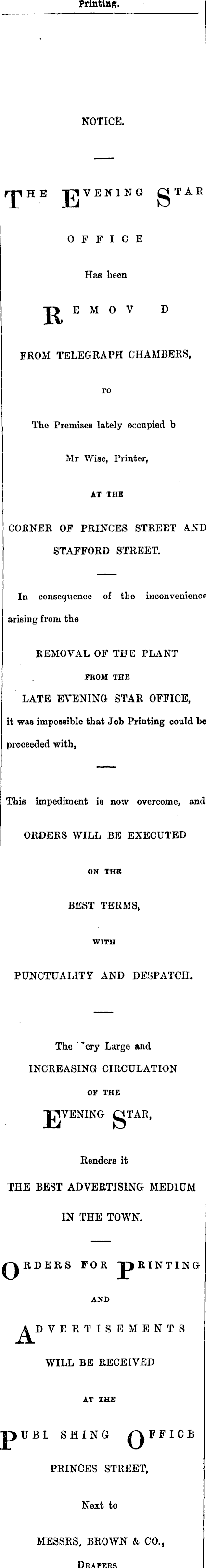 Printing. NOTICE, T H OFFICE Has been EMO V D FROM TELEGRAPH CHAMBERS, E VEN 1 N G S' J TAR TO The Premises lately occupied b Mr Wise, Printer, AT THB CORNER OF PRINCES STREET AND STAFFORD STREET. In conseqtience of tbe inconvenience arising from the REMOVAL OF THB PLANT JFBOM THE LATE EVENING STAR OFFICE, it was impossible that Job Printing could be proceeded with, This impediment is now overcome, and ORDERS WILL BE EXECUTED ON THE BEST TERMS, WITH PUNCTUALITY AND DESPATCH. The "cry Large and INCREASING CIRCULATION OV THE jgJVENING gTAR, Renders it THE BEST ADVERTISING MEDIUM IN THE TOWN. QRDBRS FOR pRINTING AND VERTISEMENTS WILL BE RECEIVED AT THB pUBI SHING OFFICE PRINCES STREET, Next to MESSRS. BROWN & CO., Drapers