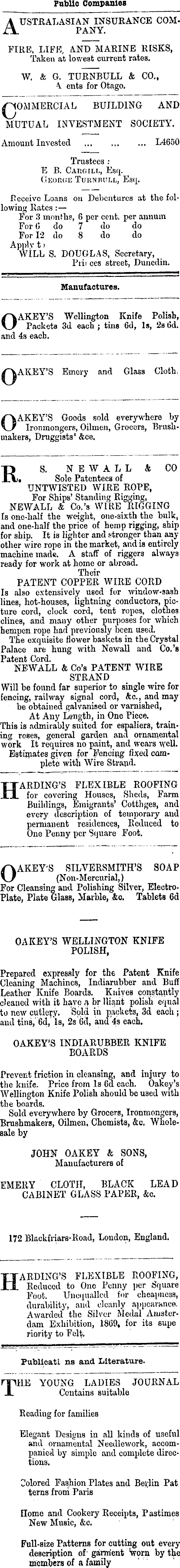 Public Companies A USTRALASIAN INSURANCE COMPANY. FIRE, LIFE, AND MARINE RISKS, Taken at lowest current rates. W. & G. TURNBULL & CO., V ents for Otago. QOMMERCIAL BUILDING AND MUTUAL INVESTMENT SOCIETY, Amount Invested L 4650 Trustees : E B. Cargill, Esq. George Turnbull, Esq. Deceive Loans on Debentures at the following Rates : For 3 months, 6 per cent, per annum For (5 do 7 do do For 12 do 8 do do Apply t > WILL S. DOUGLAS, Secretary, Pi it ces street, Dunedin. Manufactures. OAKEY’S Wellington Knife Polish, Packets 3d each ; tins 6d, Is, 2s (id, and 4s each. Emory and Glass Cloth. OAKEY’S Goods sold everywhere by Ironmongers, Oilmen, Grocers, Brushmakers, Druggists* &ce. RS. NEWALL & CO • Sole Patentees of UNTWISTED WIRE ROPE, For Ships’ Standing Rigging, NEWALL & Co.’s WIRE RIGGING Is one-half the weight, one-sixth the bulk, and one-half the price of hemp rigging, ship for ship. It is lighter and stronger than any other wire rope in the market, and is entirely machine made. A staff of riggers always ready for work at home or abroad. Their PATENT COPPER WIRE CORD Is also extensively used for window-sash lines, hot-houses, lightning conductors, picture cord, clock cord, tent ropes, clothes dines, and many other purposes for which hempen rope had previously been used. The exquisite flower baskets in the Crystal Palace are hung with Newall and Co.’s Patent Cord. NEWALL & Go’s PATENT WIRE STRAND Will be found far superior to single wire for fencing, railway signal cord, &c., and may be obtained galvanised or varnished, At Any Length, in One Piece. This is admirably suited for espaliers, training roses, general garden and ornamental work It requires no paint, and wears well. Estipiates given for Fencing fixed complete with Wire Strand, HARDING’S FLEXIBLE ROOFING for covering Houses, Sheds, Farm Buildings, Emigrants’ Cotthges, and every description of temporary and permanent residences, Reduced to One Penny per Square Foot. OAKEY'S SILVERSMITH’S SOAP (Non-Mercurial,) For Cleansing and Polishing Silver, ElectroPlate, Plate Glass, Marble, &o. Tablets 6d OAKEY’S WELLINGTON KNIFE POLISH, Prepared expressly for the Patent Knife Cleaning Machines, Indiarubber and Buff Leather Knife Boards. Knives constantly cleaned with it have a hr lliant polish equal to new cutlery. Sold in packets, 3d eacli; and tins, 6d, Is, 2s 6d, and'4s each. OAKEY’S INDIARUBBER KNIFE BOARDS Prevent friction in cleansing, and injury to the knife. Price from Is Cd each. Oakey’s Wellington Knife Polish should be used with the boards. Sold everywhere by Grocers, Ironmongers, Brushmakers, Oilmen, Chemists, &c. Wholesale by JOHN OAKEY & SONS, Manufacturers of EMERY CLOTH, BLACK LEAD CABINET GLASS PAPER, &c. 172 Blackfriars-Road, Loudon, England. HARDING’S FLEXIBLE ROOFING, Reduced to One Penny per Square Foot. Unequalled for cheapness, durability, and cleanly appearance. Awarded the Silver Medal Amsterdam Exhibition, 1869, for its supe riority to Felt, Publicati ns and Literature. The young ladies journal Contains suitable Reading for families Elegant Designs in all kinds of useful and ornamental Needlework, accompanied by simple and complete directions. Colored Fashion Plates and Berlin Pat terns from Paris Home and Cookery Receipts, Pastimes New Music, &c. Full-size Patterns for cutting out every description of- ganrient worn by the members of a family