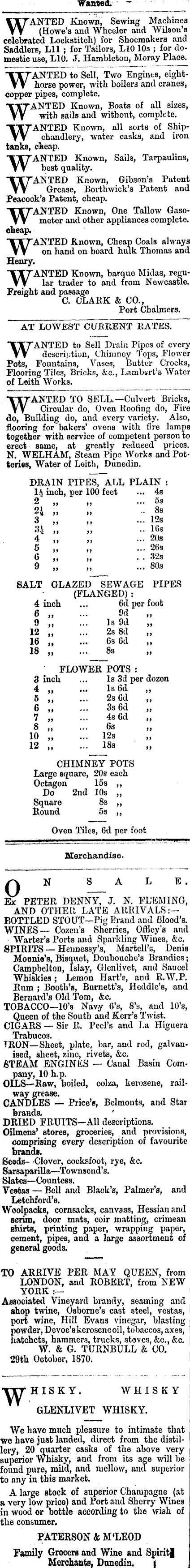 Wanted.: - WANTED Known, Sewing Machines (Howe’s and Wheeler and Wilson’s celebrated Lockstitch) for Shoemakers and Saddlers, Lll ; for Tailors, LlO 10s ; for domestic use, LlO. J. Hambleton, Moray Place. WANTED to Sell, Two Engines, eighthorse power, with boilers and cranes, copper pipes, complete. WANTED Known, Boats of all sizes, with sails and without, complete. WANTED Known, all sorts of Shipchandlery, water casks, and iron tanks, cheap. WANTED Known, Sails, Tarpaulins, best quality. WANTED Known, Gibson’s Patent Grease, Borthwick’s Patent and Peacock’s Patent, cheap. WANTED Known, One Tallow Gasometer and other appliances complete. cheap. WANTED Known, Cheap Coals always on hand on board hulk Thomas and Henry. WANTED Known, barque Midas, regular trader to and from Newcastle. Freight and passage C. CLARK & CO., Port Chalmers. AT LOWEST C CERENT KATES. WANTED to Sell Drain Pipes of every description, Chimney Tops, Flower Pots, Fountains, Yases, Butter Crocks, Flooring Tiles, Bricks, &c., Lambsrt’s Water of Leith Works. WANTED TO SELL.—Culvert Bricks, Circular do, Oven Roofing do, Fire do, Building do, and every variety. Also, flooring for bakers’ ovens with fire lamps together with service of competent person to erect same, at greatly reduced prices. N. WELHAM, Steam Pipe Works and Potteries, Water of Leith, Dunedin. Oven Tiles, 6d per foot Merchandise. /''v N SALE. Ex PETER DENNY, J, N. FLEMING, AND OTHER LATE ARRIVALS:— BOTTLED STOUT—Pig Brand and Blood’s. WINES— Gozen’s Sherries, Offley’s and Warter’s Ports and Sparkling Wines, &c. SPIRITS Hennessy’s, Martell’s, Denis Monnis’s, Bisquet, Douboucbe’s Brandies; Campbelton, Islay, Glenlivet, and Saucel Whiskies; Lemon Hart’s, and R.W.P. Rum ; Booth’s, Burnett’s, Heddle’s, and Bernard’s Old Tom, &c. TOBACCO—IO’s Navy 6’s, B’s, and 10’s, Queen of the South and Kerr’s Twist. CIGARS Sir R, Peel’s and La Higuera Trabucos. IRON—Sheet, plate, bar, and rod, galvanised, sheet, zinc, rivets, &c. STEAM ENGINES Canal Basin Company, 10 h.p. OILS—-Raw, boiled, colza, kerosene, railway grease. CANDLES Price’s, Belmonts, and Star brands. DRIED FRUITS—AII descriptions. Oilmens’ stores, groceries, and provisions, comprising every description of favourite brands. Seeds- -Clover, cocksfoot, rye, &c. Sarsaparilla—Townsend’s. Slates—Countess, Vestas Bell and Black’s, Palmer’s, and Letchford’s. Woolsacks, cornsacks, canvass, Hessian and serun, door mats, coir matting, Crimean shirts, printing paper, wrapping paper, cement, pipes, and a large assortment of general goods. TO ARRIVE PER MAY QUEEN, from LONDON, and ROBERT, from NEW YORK : Associated Vineyard brandy, seaming and shop twine, Osborne’s cast steel, vestas, port wine, Hill Evans vinegar, blasting powder, Devoe’s kerosene oil, tobaccos, axes, hatchets, hammers, trucks, stoves, &c., &c. W. & G. TURNBULL & CO. 29th October, 1870, TTTHISKY. WHISKY GLENLIVET WHISKY. We have much pleasure to intimate that we have just landed, direct from the distillery, 20 quarter casks of the above very superior Whisky, and from its age will he found pure, mild, and mellow, and superior to any in this market. A large stock of superior Champagne (at a very low price) and Port and Sherry Wines in wood or bottle according to the wish of the consumer. PATERSON & M'LEOD Family Grocers and Wine and Spirit] Merchants, Dunedin. |