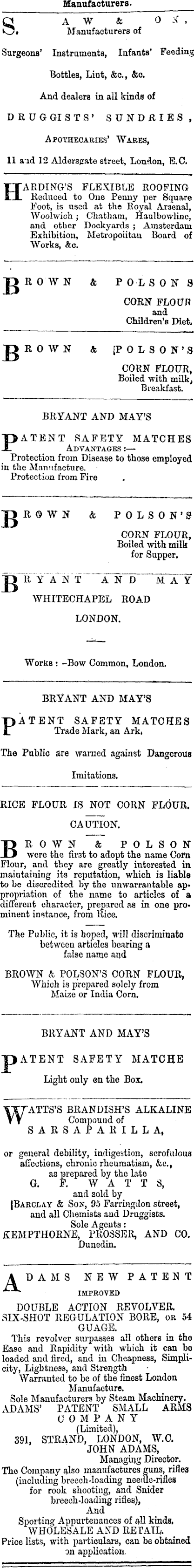 Manufacturers. SAW & 0 :> r , • Manufacturers of Surgeons’ Instruments, Infants* Feeding Bottles, Lint, &c., &o. And dealers in all kinds of DRUGGISTS’ SUNDRIES, Apothecaries’ Wares, 11 aid 12 Aldersgrate street, London, E.C. HARDING’S FLEXIBLE ROOFING Reduced to One Penny per Square Foot, is used at the Royal Arsenal, Woolwich ; Chatham, Haulbowline, and other Dockyards ; Amsterdam Exhibition, Metropolitan Board of Works, &c. B R0 W N & POISON 8 CORN FLOUR and Children’s Diet, Jg R 0 W N & |P OLSON’S CORN FLOUR, Boiled with milk, Breakfast. BRYANT AND MAY’S PATENT SAFETY MATCHES Advantages ; Protection from Disease to those employed in the Manufacture. Protection from Fire Jg R 0 W N & POLSON’S CORN FLOUR, Boiled with milk for Supper. B R Y A N T AND WHITECHAPEL ROAD LONDON. M A Y Works ; -Bow Common, London. BRYANT AND MAY’S PATENT SAFETY MATOHE Trade Mark, an Ark. S The Public are warned against Dangerous Imitations, RICE FLOUR IS NOT CORN FLOUR. CAUTION, Brown & polson were the first to adopt the name Corn Flour, and they are greatly interested in maintaining its reputation, which is liable to be discredited by the unwarrantable appropriation of the name to articles of a different character, prepared as in one prominent instance, from Rice. The Public, it is hoped, will discriminate between articles bearing a false name and BROWN & POLSON’S CORN FLOUR, Which is prepared solely from Maize or India Corn. BRYANT AND MAY’S P ATENT SAFETY MATCHE Light only en the Box. w ATTS’S BRANDISH’S ALKALINE Compound of SARSAPARILLA, or general debility, indigestion, scrofulous affections, chronic rheumatism, &c., as prepared by the late G. F. W A T T S, and sold by {Barclay & Son, 95 Farringdon street, and all Chemists aud Druggists. Sole Agents: KEMPTHORNE. PROSSER, AND CO. Dunedin. ADAMS NEW PATENT IMPROVED DOUBLE ACTION REVOLVER. SIX-SHOT REGULATION BORE, or 54 GUAGE. This revolver surpasses all others in the Ease and Rapidity with which it can be loaded and fired, and in Cheapness, Simplicity, Lightness, aud Strength Warranted to be of the finest Loudon Manufacture. Sole Manufacturers by Steam Machinery, ADAMS’ PATENT SMALL ARMS COMPANY (Limited), 391, STRAND, LONDON, W.O. JOHN ADAMS, Managing Director. The Company also manufactures guns, rifles (including breech-loading neetue-nfles for rook shooting, and Snider breech-loading rifles), And Sporting Appurtenances of all kinds, WHOLESALE AND RETAIL. Price lists, with particulars, can be obtained on application.