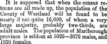 It is supposed that when the census returns are all made up, the population of the County of Westland will be found to be nearly if not quite 16,000, of whom a very large majority, probably two-thirds, are adult males. The population of Marlborough province is seldom at 5026—3076 males, and 1030 females.