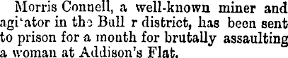 Morris Connell, a well-known miner and agi'ator in tho Bull r district, has been sent to prison for a month for brutally assaulting a woman at Addison’s Flat.