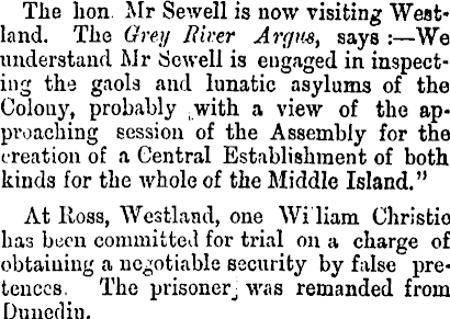 The bon Mr Sewell is now visiting Westland. The Grey Hirer Argus , says :—We understand Mr Sewell is engaged in inspecting the gaols and lunatic asylums of the Colony, probably with a view of the approaching session of the Assembly for the creation of a Central Establishment of both kinds for the whole of the Middle Island.” At Boss, Westland, one Wi'liam Christie has been committed for trial on a charge of obtaining a negotiable security by false pretences. The prisoner j was remanded from Dunedin.