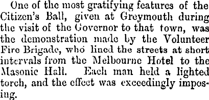 One of the most gratifying features of the Citizen’s Ball, given at Greymouth during the visit of the Governor to that town, was the demonstration made by the Volunteer Fire Brigade, who lined the streets at short intervals from the Melbourne Hotel to the Masonic Hall. Each man held a lighted torch, and the effect was exceedingly imposing.