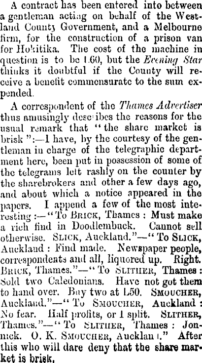 A contract has been entered into between a gentleman acting on behalf of the Westland Count) Government, and a Melbourne linn, for the construction of a prison van for Hokitika. The cost of the machine in question is to be 1.00, but the Eraiiiif/ Star thinks it doubtful if the County will receive a bcuelit commensurate to the sum expended. A correspondent of the Thanes Advertiser thus amusingly desc ! ibes the reasons for the usual remark that “ the share market is brisk I have, by the courtesy of the gentleman iu charge of the telegraphic department here, been put iu possession of some of the telegrams lelt rashly on the counter by the sharebrokers and other a few days ago, and about which a notice appeared iu the papers. I append a few of the most interesting “To Erick, Thames ; Must make a rich find in Doodlembuck. Cannot sell otherwise. Slick, Auckland.”—“ To Slick, Auckland : Find made. Newspaper people, correspondents and all, liquored up. Right. Brick, Thames.”—“To Slither, Thames: Sold two Caledonians. Have not got them to hand over. Buy two at LSO. Smoucher, Auckland.”—“ To Smoucher, Auckland : No fear. Half prolits, or 1 split. Slither, Thames.”—“To Slither, Thames: Jonmck. 0. K. Smoucher, Aucklau i.” After this who will dare deny that the share mar* ket is brisk,