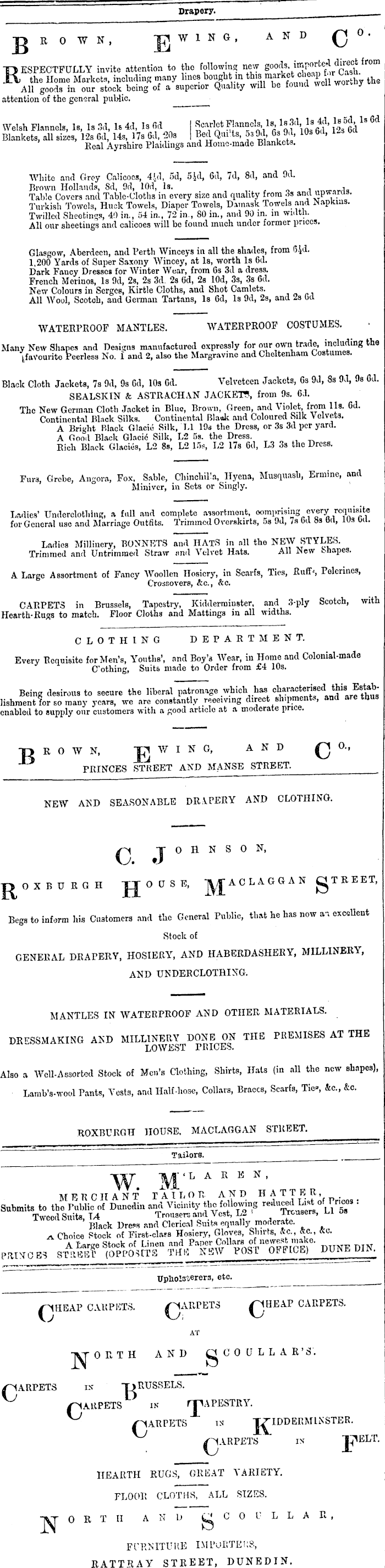 Drapery. R 0 W N , B WING AND o 0 RESPECTFULLY invite attention to the following new s '/5 1^^ r d cSS. fr0in the Home Markets, including many lines bought in ®\ 6 ‘ wcU wort hy the All goods in our stock being of a superior Quality will be found won won, j attention of the general public. Welsh Flannels, Is, Is 3d, Is 4d, Is (id Blankets, all sizes, 12s 6d, 14s, 17s Gd. HOs Real Ayrshire Plaidings I Scarlet Flannels, Is, Is 3d, Is 4d, lssd, Is 6d 1 Bed Quilts, 5s 9d, Gs 9d, 10s6d, 12s bd and Home-made Blankets. White and Grey Calicoes, 44<1, sd, 5Jd, 6d, 7d, Bd, and 9d. Brown Hollands, Sd, 9d, lOd, Is. Table Covers and Table-Cloths in every size and quality from 3s and upwaras. Turkish Towels, Huck Towels, Diaper Towels, Damask Towels and Napkins. Twilled Sheetings, 40 in., 54 in., 72 in., 80 in., and 90 in. in width. All our sheetings and calicoes will be found much under former prices. Glasgow, Aberdeen, and Perth Winceys in all the shades, from G.jd. 1,200 Yards of Super Saxony Wincey, at Is, worth Is 6d. Dark Fancy Dresses for Winter Wear, from 6s 3d a dress. French Merinos, Is 9d, 2s, 2s 3d. 2s 6d, 2s lOd, 3s, 3s 6d. New Colours in Serges, Kirtle Cloths, and Shot Camlets. All Wool, Scotch, and German Tartans, Is 6d, Is 9d, 2s, and 2s 6d WATERPROOF MANTLEt WATERPROOF COSTUMES. Many New Shapes and Designs manufactured expressly for our own trade, including the Peerless No. i and 2, also the Margravine and Cheltenham Costumes. Black Cloth Jackets, 7s 9d, 9s 6d, 10s Cd. Velveteen Jackets, Gs 9J, 8s 9d, 9s 6d. SEALSKIN & ASTRAKHAN JACKETS, from 9s. 6d. The New German Cloth Jacket in Blue, Brown, Green, and Violet from 11s. 6d. Continental Black Silks. Continental Blaok and Coloured Silk Velvets. A Bright Black Glacie Silk, LI 19s the Dress, or 3s 3d per yard. A Good Black Glaci6 Silk, L2 ss. the Dress. Rich Black Glacies, L2 Bs, L2 15s, L2 17s 6d, L 3 3s the Dress, Furs, Grebe, Angora, Fox. Sable, Chinchilla, Hyena, Musquash, Ermine, and Miniver, in Sets or Singly. Ladies’ Underclothing, a full and complete assortment, comprising every requnsite for General use and Marriage Outfits. Trimmed Overskirts, 5s 9d, 7s od »s ml, IUS mi. Ladies Millinery, BONNETS and HATS in all the NEW STYLES. Trimmed and Untrimmed Straw and Velvet Hats. All New shapes. A Large Assortment of Fancy Woollen Hosiery, in Scarfs, Ties, Ruff', Pelerines, Crossovers, &c., &c. CARPETS in Brussels, Tapestry, Kidderminster, and 3-ply Scotch, with Hearth-Rugs to match. Floor Cloths and Mattings in all widths. CLOTHING DEPARTMENT. Every Requisite for Men’s, Youths’, and Boy’s Wear, in Horae and Colonial-made C'othing, Suits made to Order from £4 10s. Being desirous to secure the liberal patronage which has shment for so many years, we are constantly receiving direct shipments, and are thus labled to supply our customers with a good article at a moderate price. T> ROW N, Xjl WIN G, AND Q 0., PRINCES STREET AND MANSE STREET. NEW AND SEASONABLE DRAPERY AND CLOTHING. ROXBURGH c. H J O H N S O N, OUSE, jy- aclaggan gTREET, Begs to inform liis Customers and tlic General PnUio, tl.at he has notv at excellent Stock of GENERAL DRAPERY, HOSIERY, AND HABERDASHERY, MILLINERY, AND UNDERCLOTHING. MANTLES IN WATERPROOF AND OTHER MATERIALS, lESSMAKING AND MILLINERY DONE ON THE PREMISES AT THE LOWEST PRICES. a Well-Assorted Stock of Men’s Clothing, Shirts, Hats (in all the new shapes), Lamb’s-wool Pants, Vests, and Half-hose, Collars, Braces, Scarfs, Tic*, &c., &c. ROXBURGH HOUSE, MACLAGGAN STREET. Tailors. '‘ L A R E N , MERCHANT TAILOR. AND HATTER, »to the Public of Dunedin and Vicinity the following re “ of L^ n 5 C s ° S 5 Tweed Suits. L 4 Trousers and Vest, L2 irensers, Black Dress and Clerical Suits equally moderate. < a Choice Stock of First-class Hosiery, Gloves, Shirts, kc., &c,, &c. A Large Stock of Linen “d CoUwa newest make. 3ES ST it EEC (OPPOSITE THE NSW POST OFbLCE) .QUiMfl Upholsterers, etc. C M HEAP CARPETS. a ARPETS C HE HEAP CARPETS. AT c a C 0 U L L A R’S, ORTH AND g C ARPETS xx -IjRUSSELS. ARPETS D in fJIAPESTRY. /"I ARPETS iK K 1 "ARPETS ik TT^ELF. o ’IDDERMLNSTER. F HEARTH RUGS, GREAT VARIETY. N FLOOR CLOTHS, ALL SIZES. ORTH AND C O V LL A R , FV RN ITU UE IM PORTE US, RATTRAY STREET, DUNEDIN.