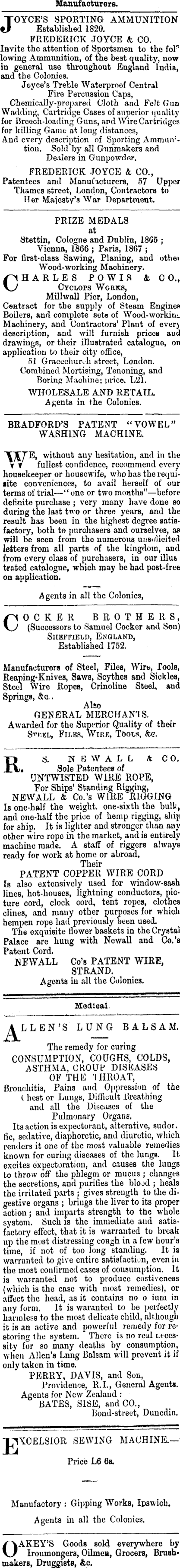 Manufacturers. JOYCE’S SPORTING AMMUNITION Established 1820. FREDERICK JOYCE k CO. Invite the attention of Sportsmen to thefforl r lowing Ammunition, of the beat quality, now in general use throughout England India, and the Colonies. Joyce’s Treble Waterproof Central Fire Percussion Caps, Chemically-prepared Cloth and Felt Gun Wadding, Cartridge Cases of superior quality for Breech-loading Guns, and Wire Cartridges for killing Game at long distances, And every description of Sporting Ammun : - tiou. Sold by all Gunmakers and Dealers in Gunpowder. FREDERICK JOYCE & CO., Patentees and Manufacturers, 57 Upper Thames street, London, Contractors to Her Majesty's War Department. PRIZE MEDALS at Stettin, Cologne and Dublin, 1865 ; Vienna, 1866 ; Paris, 1867 ; For first-class Sawing, Planing, and otbei Wood-working Machinery. CHARLES POWIS & 0 0., Cyclops Works, Millwall Pier, London, Contract for the supply of Steam Engines Boilers, and complete seta of Wood-working Machinery, and Contractors’ Plant of everj description, and will furnish prices and drawings, or their illustrated catalogue, on application to their citj' office, 51 Graced lurch street, London. Combined Mortising, Tenoning, and Boring Machine; price, L2l. WHOLESALE AND RETAIL. Agents in the Colonies. BRADFORD’S PATENT “VOWEL” WASHING MACHINE. W E C without any hesitation, and in the * 1 fullest confidence, recommend every housekeeper or housewife, who has the requisite conveniences, to avail herself of our terms of trial —“one or two months”—before definite purchase ; very many have done so during the last two or three years, and the result has been in the highest degree satisfactory, both to purchasers and ourselves, as will be seen from the numerous unsolicited letters from all parts of the kingdom, and from every class of purchasers, in our Ulus trated catalogue, which may be bad post-free on application. Agents in all the Colonies, COCKER BROTHERS, (Successors to Samuel Cocker and Son) Sheffield, England, Established 1752. Manufacturers of Steel, Files, Wire, Tools, Reaping-Knives, Saws, Scythes and Sickles, Steel Wire Ropes, Crinoline Steel, and Springs, &c.. Also GENERAL MERCHANTS. Awarded for the Superior Quality of their S’tkel, Files, Wire, Tools, &g. RS. NEWALL AGO. . Sole Patentees of UNTWISTED WIRE ROPE, For Ships’ Standing Rigging, NEWALL & Co.’s WIRE RIGGING Is one-half the weight, one-sixth the bulk, and one-half the price of hemp rigging, ship for ship. It is lighter and stronger than any other wire rope in the market, and is entirely machine made. A staff of riggers always ready for work at home or abroad. Their PATENT COPPER WIRE CORD Is also extensively used for window-sash lines, hot-houses, lightning conductors, picture cord, clock cord, tent ropes, clothes dines, and many other purposes for which hempen rope had previously been used. The exquisite flower baskets in the Crystal Palace are hung with Newall and Co.’s Patent Cord. NEWALL Co’s PATENT WIRE, STRAND. Agents in all the Colonies. Medical. LUNG BALSAM. The remedy for curing CONSUMPTION, COUGHS. COLDS, ASTHMA, CROUP DISEASES OF THE IHROAT, Bronchitis, Pains and Oppression of the I best or Lungs, Difficult Breathing and all the Diseases of the Pulmonary Organs. Its action is expectorant, alterative, sudor, fic, sedative, diaphoretic, and diuretic, which renders it one of the most valuable remedies known for curing diseases of the lungs. It excites expectoration, and causes the lungs to throw off the phlegm or mucus ; changes the secretions, and purifies the blood ; heals the irritated parts ; gives strength to the digestive organs ; brings the liver to its proper action; and imparts strength to the whole system. Such is the immediate and satisfactory effect, that it is warranted to break up the most distressing cough in a few hour’s time, if not of too long standing. It is warranted to give entire satisfaction, even in the most confirmed cases of consumption. It is warranted not to produce costiveness (which is the case with most remedies), or affect the head, as it contains no o ium in any form. It is waranted to be perfectly harmless to the most delicate child, although it is an active and powerful remedy for restoring tlie system. There is no real necessity for so many deaths by consumption, when Allen’s Lnng Balsam will prevent it if only taken in time. PERRY, DAVIS, and Son, Providence, R. 1., General Agents. Agents for New Zealand : BATES, SISE, and CO., Bond-street, Dunedin, SEWING MACHINE.— Price L 6 6s. Manufactory : Gipping Works, Ipswich. Agents in all the Colonies. OAKEY’S Goods sold everywhere by Ironmongers, Oilmen, Grocers, Brushmakers, Druggists, &c.