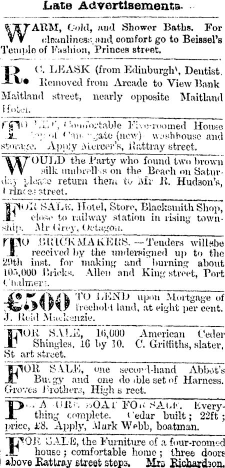 Late AdvertisementsWAHM, Cold, and Shower Baths. For cleanliness:, and comfort go to Beissel’s Temple of Fashion, Princes street. K< •• LEASK (from Edinburgh', Dentist. • llomovcd from Arcade to View Bank Maitland street, nearly opposite Maitland Hotel. rgl') 5 ,i. < io'KMvtabJe Five-roomed House .iL '*i' < ’an. -gate (now)- washhouse and storage. Apply iVlomVs, itattray street. WOULD the Party who found two brown silk umluvll .s on the Beach on Saturday ploa'o return them to Mr il. Hudson’s, I line e. : street. TN'Li SALK. Hotel, Store, Blacksmith Shop, _M_ el we to railway station in rising townsitij*. Mr Li e}-, Octagon. r«U BULGE MAREUS. —Tenders willsbe fi. received by the undersigned up to the 20th hint, for making and burning about 10\000 Bricks. Allen and King; street, Port tli.dmen. X& ~ I t) LEND upon Mortgage of freehold land, at eight per cent. J. Ueid Mackenzie. FOB SALE, 1(5,000 American Geder Shingles, iG by 10. C. Griffiths, slater, St art street. FOR SALE, one second-hand Abbot’s Bmgy and one doffilesetof Harness. Groves Brothers, High s reet. P' . A -Oil'". -jOAf EOo- SALIV. Everything complete. «'edar built; 22ft ; I price, 1-8. Apply, AJ ark W ebb, boatman. SALE, the Furniture of a four-roomed 1 house ; comfortable homo ; three doors I above Eattray street steps. Mrs Eicharthon.