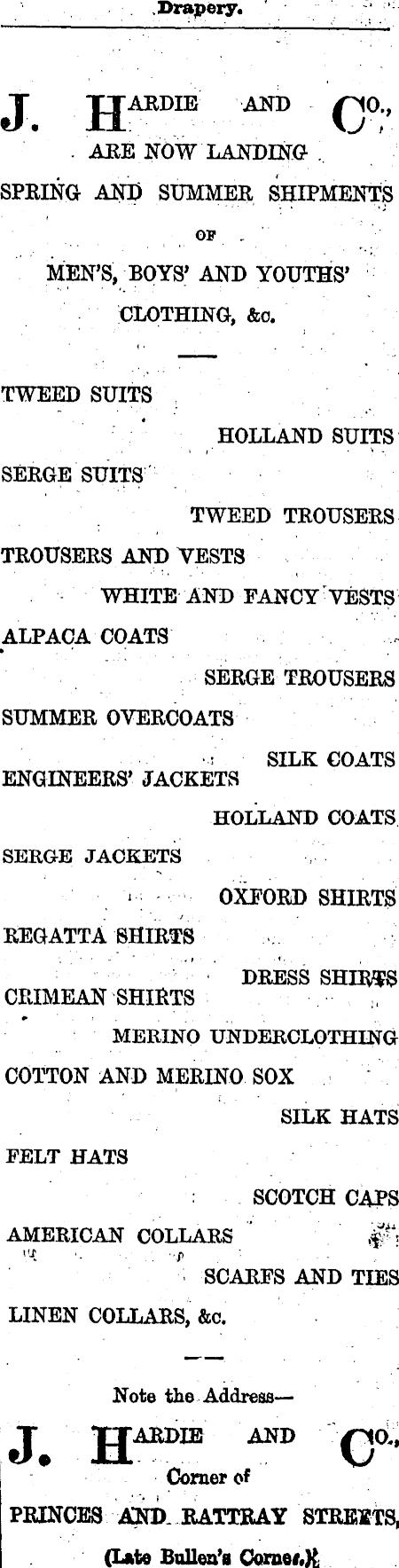 .Drapery. J ~pj ARDIE and . ARE NOW LANDING SPRING AND SUMMER SHIPMENTS op , MEN’S, BOYS’ AND YOUTHS’ CLOTHING, &o. TWEED SUITS HOLLAND SUITS SERGE SUITS ! TWEED TROUSERS TROUSERS AND TESTS WHITE AND FANCY VESTS ALPACA COATS ... SERGE TROUSERS SUMMER OVERCOATS SILK GOATS ENGINEERS’ JACKETS HOLLAND COATS SERGE JACKETS ' OXFORD SHIRTS REGATTA SHIRTS DRESS SHIRTS CRIMEAN SHIRTS MERINO UNDERCLOTHING COTTON AND MERINO SOX SILK HATS FELT HATS : SCOTCH CAPS AMERICAN COLLARS SCARFS AND TIES LINEN COLLARS, &c. 0., Note the Address— J g[ ARI>I3B AND Comer of PRINCES AND. RATTRAY STREETS, (Late Sullen's Comoi.H