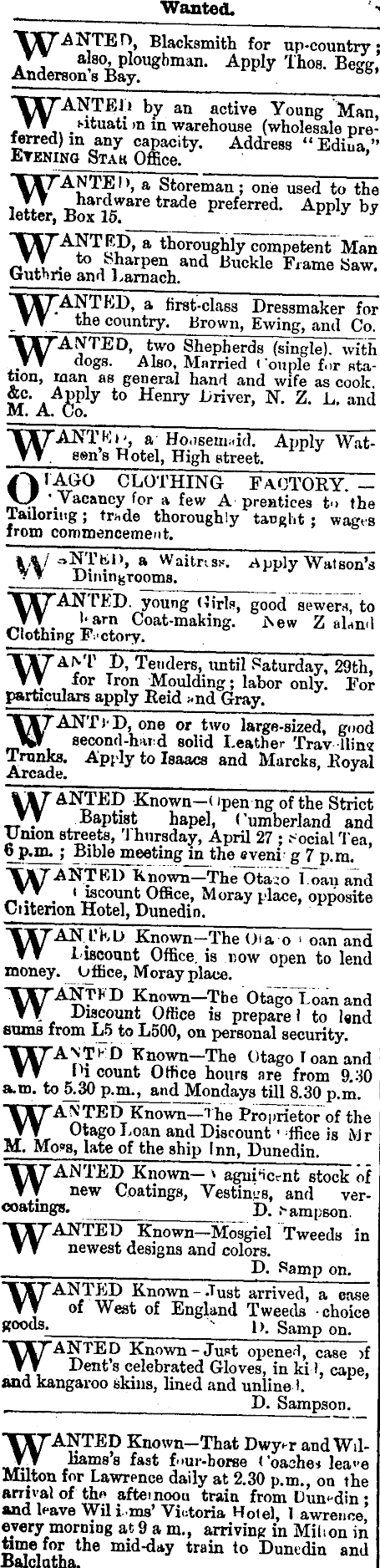 Wanted. VXTANTED, Blacksmith for up-country; A v , also, ploughman. Apply Thos. Begg. Anderson s Bay. 8 WANTED by an active Young Man, . ntuatx m in warehouse (wholesale preferred) m any capacity. Address “Ediua.” Evening Stak Office. XTTANTEI>, a Storeman; one used to the letter BolTlS trade preferred * Apply by WANTED, a thoroughly competent Man . Sharpen and Buckle Frame Saw. uutDfte and Larnach. WANTED, a first-class Dressmaker for the country. Brown, Ewing, and Co. WANTED, two Shepherds (single), with dogs. Also, Married <on pie for station, man as general hand and wife as cook. Henry Driver, N. Z. L, and ANTEi', a Ho.iseuii-id. Apply Wateen’s T-l otel, High street. OTAGO CLOTHING FACTORY. - ’ Vacancy for a few A prentices t» the Tailoring; trade thoroughly taught ; wagt s from commencement. W lil/ -aNThll), a Waitnss. ? v Diningrooms. Apply Watson’s WANTED, young Girls, good sewers, to Earn Coat-making. jNew Z aland Clothing Factory. WANT D, Tenders, imtil Saturday, 29th, for Iron Moulding; labor only. For particulars apply Reid *nd Gray. WANT )• D, one or two large-sized, good U second-hand solid Leather Trav llin? Trnnks. Apply to Isaacs and Marcks, Eoyal Arcade. WANTED Known—(ipen ng of the Strict Baptist hapel, Cumberland and Umon streets, Thursday, April 27 ; Social Tea, o P- m -; Bible meeting in the cveni- g 7 p.m. "'tAJT ANTED Known—The Loan and _ . 1 iscount Office, Moray place, opposite Cutenon Hotel, Dunedin, WANTED Known—The Ota o > oan and Discount Office, is now open to lend money. Office, Moray place. WANTED Known—The OtagoToanand Discount Office is prepare 1 to lend stuns from L 5 to LSOO, on personal security. WANTED Known—The OtagoToanand count Office hours are from 9,30 a.m. to p.m., and Mondays till 8.30 p.m. WANTED Known—The Proprietor of the Otago Loan and Discount ■ ffice is Mr M. Mops, late of the ship Inn, Dunedin. WANTED Known— ' aguidcrnt stock of new Coatings, Vestings, and vercoatings. D. f-ampson. ANTED Known—Mosgiel Tweeds in newest designs and colors. D. Ramp on. w WANTED Known--Tust arrived, a casi of West of England Tweeds ■ choic Roods- s 1). Samp on. WANTED Known-Just opened, case Dent’s celebrated Gloves, in Id 1, cape, and kangaroo skins, lined and unline 1. - D. Sampson. WANTED Known—That Dwy*-r and Williams’s fast fuur-borse Coaches leave Milton for Lawrence daily at 2.30 p.m., on the arrival of the afternoon train from Dunedin; and leave Wil Dins’ Victoria Hotel, I awrenne, every morning at 9 a m., arriving in Milion in time for the mid-day train to Dunedin and Ealclntha.