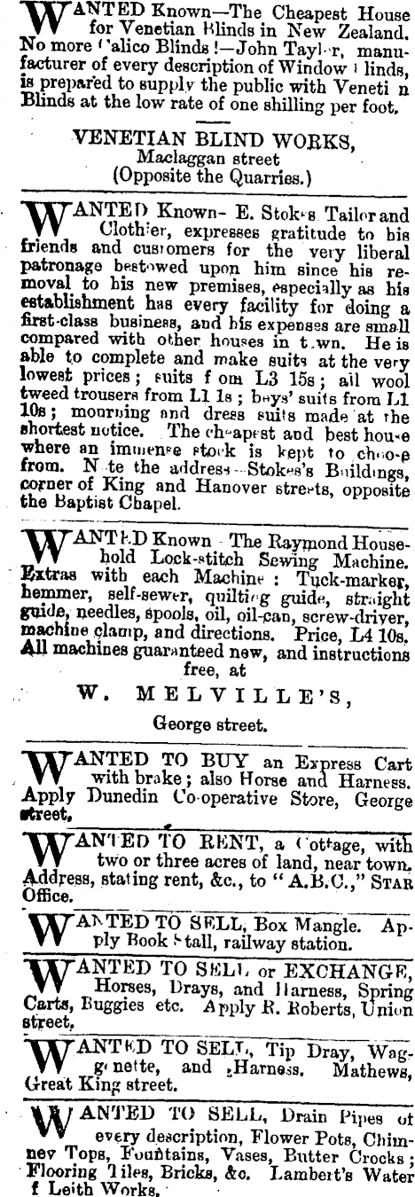 WANTED Known—The Cheapest House for Venetian Winds in New Zealand. No more < 'alico Blinds!— John Tayl r, manufacturer of every description of Window i linds, is prepared to supply the public with Yeneti n Blinds at the low rate of one shilling per foot, VENETIAN BLIND WOBKS, Maclaggan street (Opposite the Quarries.) WANTED Known- E. Stokes Tailor and Clothier, expresses gratitude to his friends and customers for the very liberal patronage bestowed upon him since his removSf» ?° new P re «dseß, especially as his establishment has every facility for doing a first-class business, and his expenses are small compared with other houses in t ,wn. He is able t.o complete and make suits at the very lowest prices; suits fcm L 3 15s; all wool tweed trousers from LI la ; boys’ suits from LI 10s; mourning and dress suits made at the shortest notice. The ch u apest and best hou-e where an immense stork is kept to ch- o-p from. Nte the address—Stokes’s Buildings, ajjrnerof King and Hanover streets, opposite the Baptist Chapel. Raymond Household Lock-stitch Sewing Machine. Extras with each Machine : Tuck-marker, hemmer, self-sewer, quiltieg guide, straight guide, needles, Spools, oil, oil-can, screw-driyer, machine clamp, and directions. Price, L4los, AB machines guaranteed new, and instructions free, at W. MELVILLE’S, George street. TO BUY an Express Cart with brake; also Horse and Harness. Apply Dunedin Co operative Store, George ■treet, WANTED 70 BENT, a < ot*age, with two or three acres of land, near town. Address, stating rent, &c., to “ A.8.C,” Stab Office. WAITED TO SELL, Box Mangle. Apply Book Hall, railway station. W" ANTED TO SELL or EXCHANGE, Horses, Drays, and Harness, Spring Carts, Buggies etc. Apply R. Boberts, Union street, WANTED TO SELL, Tip Dray, Wag, g( nette, and .Harness, Mathews, Great King street. ANTED TO SELL, Drain Pipes ot every description, Flower Pots, Chimney Tops, Fountains, Vases, Butter Crocks • Flooring 7 iles, Bricks, &o. Lambert’s Water f Le<tb Works.