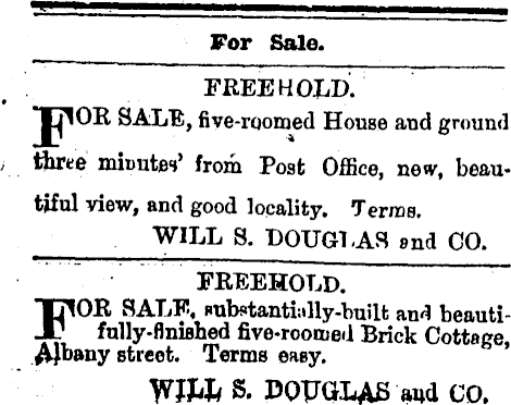 For Sale. FREEHOLD. "jplOß SALE, five-roomed House aud ground three minutes’ from Post Office, new, beautiful view, and good locality. Terms. WILL S. DOUGLAS and 00. FREEHOLD. FOR SALE, nubstantLlly-builfc and beauti-fully-finished five-roomed Brick Cottage, Albany street. Terms easy. WILL 5. DOUGLAS and CO.