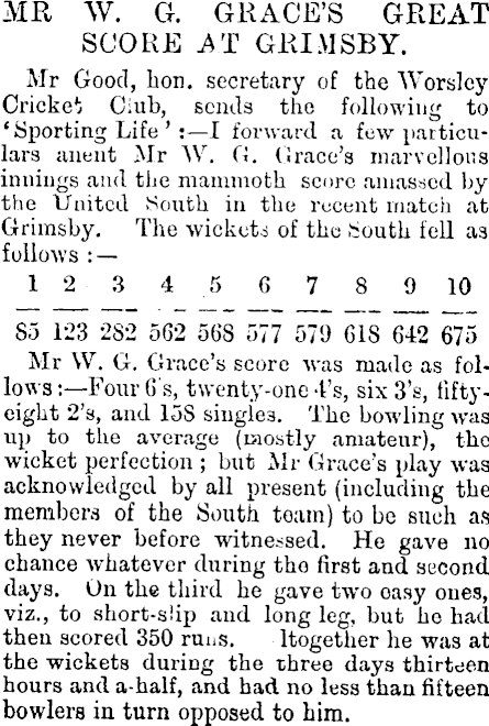 MR \V. G. GRACE'S GREAT SCORE AT GRIMSBY. Mr Good, hon. secretary of the Worsley Cricket Ciub, sends the following to ' Sporting Life ' :—I forward a few particulars anent Mr W. G. Grace's marvellous innings and the mammoth score amassed by the United South in the recent match at Grimsby. The wickets of the South fell as follows : 123 4 5 6 7 8 9 10 85 123 252 562 568 577 579 CIS 642 675 Mr W. G. Grace's score was made as follows :—Four 6's, twenty-one 4's, six 3's, fiftyeight 2's, and 13S singles. The bowding was up to the average (mostly amateur), the wicket perfection ; but Mr Grace's play was acknowledged by all present (including the members of the South team) to be such as they never before witnessed. He gave no chance whatever during the first and second days. On the third he gave two oasy ones, viz., to short-slip and long leg, but he had then scored 350 runs. ltogether he was at the wickets during the three days thirteen hours and a-half, and had no less than fifteen bowlers in turn opposed to him.