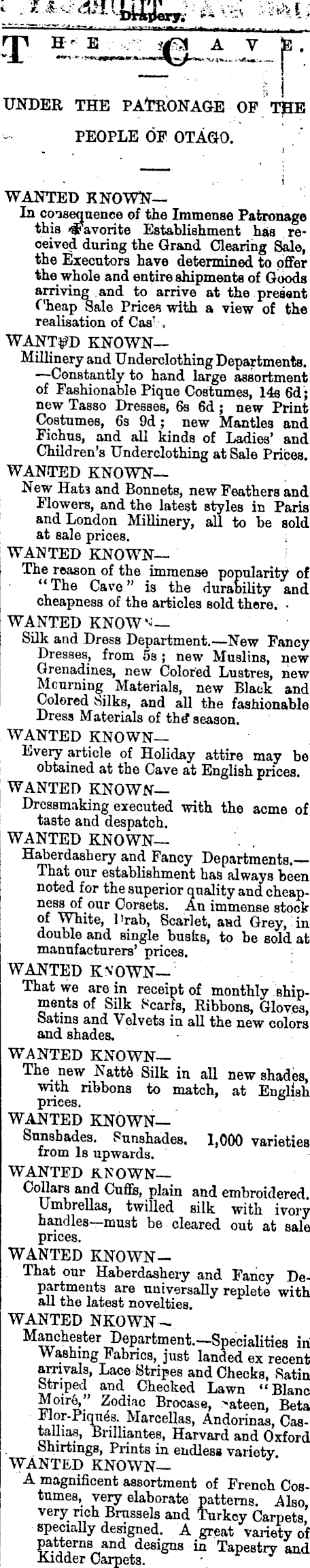 mi T H' E i#3l A V p , .v-rfßfcW;-,-*. I UNDER THE PATRONAGE OP THE PEOPLE OF OTAGO. WANTED KNOWN— Ia consequence of the Immense Patronage this favorite Establishment has received during the Grand Clearing Sale, the Executors have determined to offer the whole and entire shipments of Goods arriving and to arrive at title present Cheap Sale Prices with a view of the realisation of Casl, WANTED KNOWN— Millinery and Underclothing Departments. —Constantly to hand large assortment of Fashionable Pique Costumes, 14s 6d; new Tasso Dresses, 6s 6d; new Print Costumes, 6s 9d; new Mantles and Fichus, and all lands of Ladies’ and Children’s Underclothing at Sale Prices. WANTED KNOWN— New Hats and Bonnets, new Feathers and Flowers, and the latest styles in Paris and London Millinery, all to be sold at sale prices. WANTED KNOWN— The reason of the immense popularity of “The Cave” is the durability and cheapness of the articles sold there. • WANTED KNOW'*— Silk and Dress Department.—New Fancy Dresses, from 5s ; new Muslins, new Grenadines, new Colored Lustres, new Mourning Materials, new Black and Colored Silks, and all the fashionable Dress Materials of thd season. WANTED KNOWN— Every article of Holiday attire may be obtained at the Cave at English prices. WANTED KNOWN— Dressmaking executed with the acme of taste and despatch. WANTED KNOWN— Haberdashery and Fancy Departments.— That our establishment has always been noted for the superior quality and cheapness of our Corsets. An immense stock of White, I'rab, Scarlet, and Grey, in double and single busks, to be sold at manufacturers’ prices. WANTED KNOWN— That we are in receipt of monthly shipments of Silk Scarfs, Ribbons, Gloves, Satins and Velvets in all the new colors and shades. - WANTED KNOWN— The new N att6 Silk in all new shades, with ribbons to match, at English prices. WANTED KNOWN— Sunshades. Sunshades. 1,000 varieties from Is upwards. WANTED KNOWN— Collars and Cuffs, plain and embroidered. Umbrellas, twilled silk with ivory handles—must be cleared out at sale prices. WANTED KNOWN— That our Haberdashery and Fancy Departments are universally replete with all the latest novelties. WANTED NKOWN—ePartment.—Specialities in Washing Fabrics, just landed ex recent arrivals, Lace Stripes and Checks, Satin Striped and Checked Lawn “Blanc Moir6,” Zodiac Brooase, >ateen, Beta Flor-PWs. Marcellas, Andorinas, Castallias, Brilliantes, Harvard and Oxford Shirtings, Prints in endless variety. WANTED KNOWN— A magnificent assortment of French Costumes, very elaborate patterns. Also, very nch Brussels and Turkey Carpets, specially designed. A great variety of EdderOa^t deSignS Tapeßtry aud