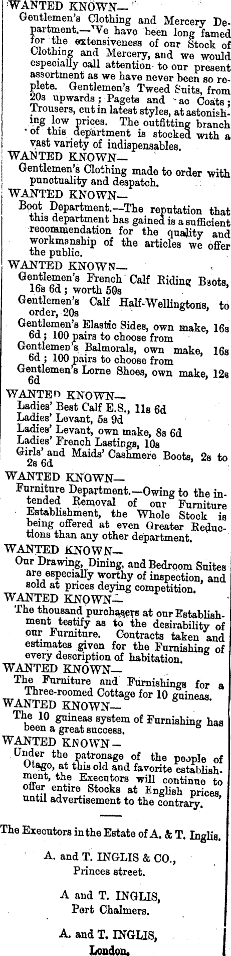 WANTED KNOWN— Gentlemen’s Clothing and Mercery Department.—We have been long famed extensiveness of onr Stock of Clothing and Mercery, and we would especially call attention- to onr present assortment as we have never been so replete. Gentlemen’s Tweed Suits, from 20s upwards; Pageta and “ao Coats; trousers, cut in latest styles, at astonishxng low prices. The outfitting branch •of this department is stocked with a vast variety of indispensables, WANTED KNOWN— Gentlemen’s Clothing made to order with punctuality and despatch. WANTED KNOWN— Boot Department.—The reputation that this department has gained is a sufficient recommendation for the quality and workmanship of the articles we offer the public. WANTED KNOWN— Gentiemen’s French Calf Hiding Baots, 16s fid; worth 60s * Gentlemen’s Caff Half-Wellingtons, to order, 20s Gentlemen’s Elastic Sides, own make, 16s fid; 100 pairs to choose from Gentlemen s Balmorals, own make. 16s fid ; 100 pairs to choose from Gentlemen s Lome Shoes, own wulra J2s fid Boots, 2s WANTED KNOWN— Ladies’ Best Caff 8.5., 11s fid Ladies’ Levant, 6s 9d Ladies’ Levant, own make, 8s fid Ladies’ French Lasticgs, 10s Girls’ and Maids’ Cashmere ! 2s fid WANTED KNOWN— Furniture Department.— Owing to the ii Removal of our Fumitui Establishment, the Whole Stock being offered at even Greater Kedm tlons than any other department. WANTED KNOWN— Our Drawing Dining, and Bedroom Suit* are especially worthy of inspection, an sold at prices deying competition. WANTED KNOWN— The thousand purchasers at ourEstablisl men \J ies^ as desirability c pur Furniture. Contracts taken an estimates given {or the Furnishing c every description of habitation. WANTED KNOWN— The Furniture and Furnishings for ; Three-roomed Cottage for 10 guineas WANTED KNOWN— 8 The 10 guineas system of Furnishing ha been a great success. ° WANTED KNOWN Under the patronage of the people o u tago, at this old and favorite establish ment, the Executors will continue t( offer entire Stocks at English prices until advertisement to the contrary. The Executors in the Estate of A. & T. Tnglin, A. and T. INGLIS & CO., Princes street. A and T. INGLIS, Port Chalmers. A. and T. INGLIS, Loudon*