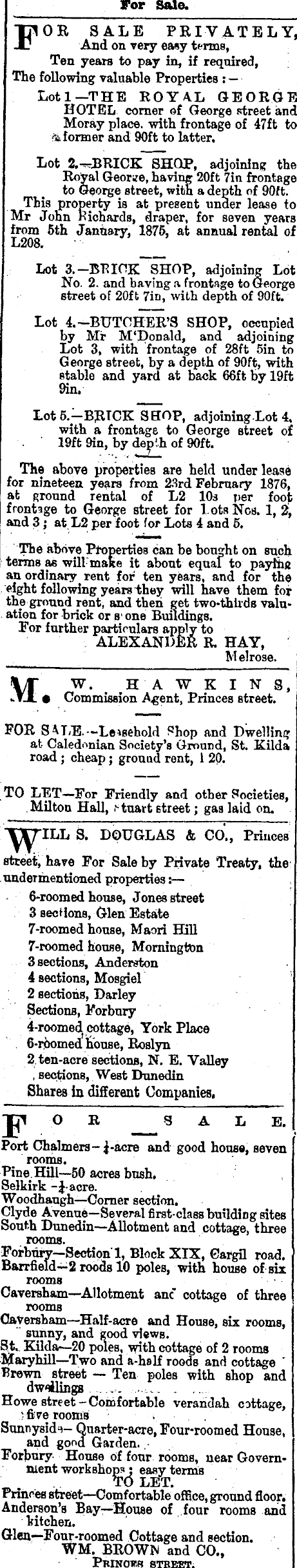 For Sale. For sale privately, And on very easy terms, Ten years to pay in, if required, The following valuable Properties : Loti—THE ROYAL GEORGE HOTEL corner of George street and Moray place, with frontage of 47ft to former and 90ft to latter. Lot 2,-wBRICK SHOP, adjoining the Royal George, having 20ft 7in frontage to George street, with a depth of 90ft. This property is at present under lease to Mr John Kichards, draper, for seven years from 6th January, 1876, at annual rental of L2OB, Lot 3. —BTJIOK SHOP, adjoining Lot No. 2. and having a frontage to George street of 20ft 7in, with depth of 90ft. Lot 4.—BUTCHER’S SHOP, occupied by Mr M'Donald, and adjoining Lot 3, with frontage of 28ft sin to George street, by a depth of 90ft, with stable and yard at back 66ft by 19ft 9in. Lots. —BRICK SHOP, adjoining-Lot 4. with a frontage to George street of 19ft 9in, by dep'.h of 90ft. The above properties are held under lease for nineteen years from 23rd February 1876, at ground rental of L2 10s per foot frontage to George street for l ots Nos. 1, 2, and 3 J at L2 per foot for Lots 4 and 6. The above Properties can be bought on such terms as willmake it about equal to paying an ordinary rent for ten years, and for the eight following years-they will have them for the ground rent, and then get two-thirds valuation for brick or s' one Buildings. For further particulars apply to ALEXANDER R. HAY, Melrose. Vf W. HAWKINS, -vX • Commission Agent, Princes street. FOR SALE.--Leasehold Phop and Dwelling at Caledonian Society’s Ground, St. Kilda road; cheap j ground rent, 1 20. TO LET—For Friendly and other Societies, Milton Hall, •‘-tuart street; gas laid on. W ILL S. DOUGLAS & CO., Princes street, have For Sale by Private Treaty, theundermentioned properties:— 6- house, Jones street 3 sections, Glen Estate 7- house, Maori Hill 7-roomed house, Momingtbn 3 sections, Anderston 4 sections, Mosgiel 2 sections, Darley Sections, Forbury cottage, York Place . 6-rbomed house, Roslyn 2, ten-acre sections, N. B. Valley , sections, West Dunedin Shares In different Companies, OR SALE. Port Chalmers- |-acre and good house, seven __ rooms. Pine. Hill—so acres bush. Selkirk -J-acre. Woodhangh—Comer section. Clyde Avenue—Several first-class building sites South Dunedin—Allotment and cottage, three rooms. Forbury—Section 1, Block XIX, Cargfl road, Barrfield—2 roods 10 poles, with house of six rooms Cavcrsham—Allotment anc cottage of three rooms Oayersham—Half-acre and House, six rooms, sunny, and good views. St., Kilda-—2O poles, with cottage of 2 rooms Maryhill—Two and a-half roods and cottage ' Brown street Ten poles with shop and dwellings . .... . Howe street-Comfortable verandah cottage, ■ five rooms . , Sunnysids— Quarter-acre, Four-roomed House, and good Garden. Forbury- House of four rooms, near Government workshops: easy terms TO LET. Princes street—Comfortable office, ground floor, Anderson’s Bay—House of four rooms and kitchen. ' Glen—Fonr-roomed Cottage and section. WM. BROWN and CO., Pkinovh stbeet.
