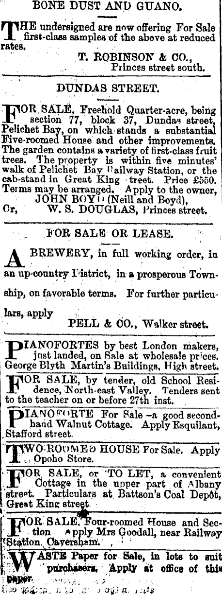 BONE DUST AND GUANO. THE undersigned are now offering For Sale . firat-clasa samples, of the above at reduced T. ROBINSON & 00., Princes street south. DUNDAS STREET. FOR. SALE, Freehold Quarter-acre, being section 77, block 37, Lundas street, Pelichet Bay, on which'stands a substantial Five-roomed House and other improvements. The garden contains a variety of first-class fruit trees. Theproperty is within five minutes’ walk of Pelichet Bay Hallway Station, or the cab-stand in Great King • treet. Price £650. Terms may be arranged. Apply to the owner, JOHN BOYI . (Neill and Boyd), Or, W. S, DOUGLAS, Princes street. i , FOR SALE OR LEASE. I BREWERY, in full working order, in an up-country District, in a prosperous Township) on favorable terms. For further particulars, apply FELL & 00., Walker street. PIANOFORTES by best London makers, just landed, on Sale at wholesale prices. George Blyth Martin’s Buildings, High street, j FOR SALE, by tender, old School Residence, North-east Valley. Tenders sent to the teacher on or before 27tn inst. PIANO *RTE For Sale—a good secondhand Walnut Cottage. Apply Esquilant, .Stafford street. mwO-ROt MVI E y HOUSE For Sale. Apply JL v j Opoho Store. FOR, SALE, or 'TO LET, a convenient Cottage in the upper part , of Albany street. Particulars at Battaon’s Coal Depfit, Great King street. : |/IOR BALE/Four-roomed House and SecJ} tion * pply Mrs Goodall, near Railway 5 Station. Cayerahafn, ASTB Paper for. Sale, in lots to purchasers, Apply at office of R'jo oyi.! ff. )■-•**s