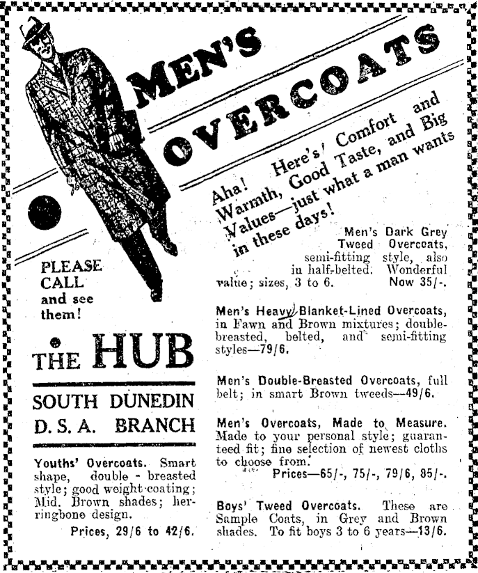 c® toV’ ®.vv o A 6, a.t> *s> ?'SS W Men’s Dark Grey Tweed Overcoats, * . semi-fitting style, . also .; ■ - in halfrbelted: Wonderful value; sizes. 3 to 6. Now 35/-. PLEASE CALL and see them! Men’s Heavy^Blanket-Lined Overcoats, in Fawn and Brown mixtures; doublebreasted, belted, and* semi-fitting breasted, belted, styles—-79/6, HUB THE SOUTH DUNEDIN D.S.A. BRANCH Youths’ Overcoats. Smart shape, double - breasted style; good weight coating; Mid. Brown shades; herringbone design. Prices, 29/6 to 42/6. Men’s Double-Breasted Overcoats, full belt; in smart Brown tweeds— 49/6. Men’s Overcoats, Made to, Measure. Made to your personal style; guaranteed fit; fine selection of newest cloths to choose from.' Prices—6s/-, 75/-, 79/6, 85/-. Boys’ Tweed Overcoats. These are Sample Coats, in Grey and Brown shades. To fit boys 3to 6 years—l3/6.