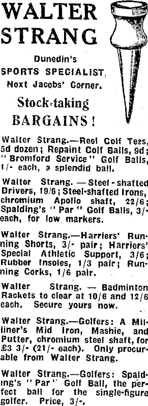 WALTER (3 STRANG CJ Dunedin's u fm SPORTS SPECIALIST, I fl Next Jacobs’ Corner. 1 m Stock-taking \| BARGAINS! * Walter Strang.—Reel Coif Tees, 5d dozen; Repaint Coif Balls, 9d; “ Bromford Service” Golf Balls, »/• each, a splendid ball. Walter Strang. steel - shafted Drivers, 19/6; Steel-shafted Irons, chromium Apollo shaft, 22/6; Spalding’s “ Par ” Golf Balls, 3/each, for low markers. Walter Strang.—Harriers’ Running Shorts, 3/- pair; Harriers’ Special Athletic Support, 3/6; Rubber Insoles, t/3 pair; Running Corks, 1/G pair. Walter Strang. Badminton Rackets to clear at io/e and 12/6 each. Secure yours now. Walter Strang.—Golfers: A Milliner’s Mid Iron, Mashie, and Putter, chromium steel shaft, for £3 3/- (21/- each). Only procurable from Walter Strang. Walter Strang.—Golfers: Spalding’s “Par’’ Golf Ball, the perfect ball for the single-figure golfer. Price, 3/-.