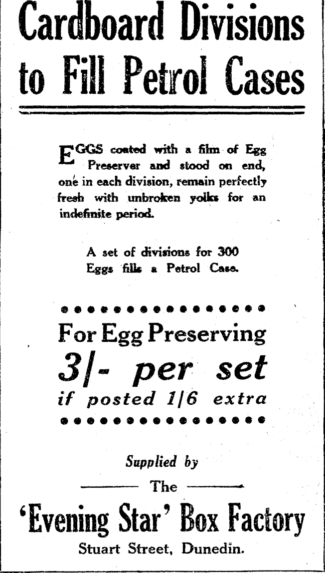 Cardboard Divisions to Fill Petrol Cases HOGS costed with a film of Egg Preserver and stood on end, one in each division, remain perfectly fresh with unbroken yolks for an indefinite period. A set of divisions for 300 Eggs fids a Petrol Casa. •••••••••••••••• For Egg Preserving 3j- per set if posted 1/6 extra •••••••••••••••• Supplied by The ‘Evening Star’ Box Factory Stuart Street, Dunedin.