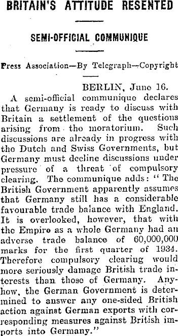 BRITAIN'S ATTITUDE RESENTED SEMI-OFFICIAL COMMUNIQUE Press Association—By Telegraph-r Copyright BERLIN, Juno 16. A semi-official communique declares that Germany is ready to discuss with Britain a settlement of the questions arising from tho moratorium. Such discussions are already in progress with the Dutch and Swiss Governments, but Germany must decline discussions under pressure of a threat of compulsory clearing. Tho communique adds: “The British Government apparently assumes that Germany still has a considerable favourable trade balance with England. It is overlooked, however, that with tho Empire as a whole Germany had an adverse trade balance of 60,000,000 marks for the first quarter of 1934. Therefore compulsory clearing would more seriously damage British trade interests than, those of Germany. Anyhow, the German Government is determined to answer any one-sided British action against German exports with corresponding measures against British imports into Germany.”