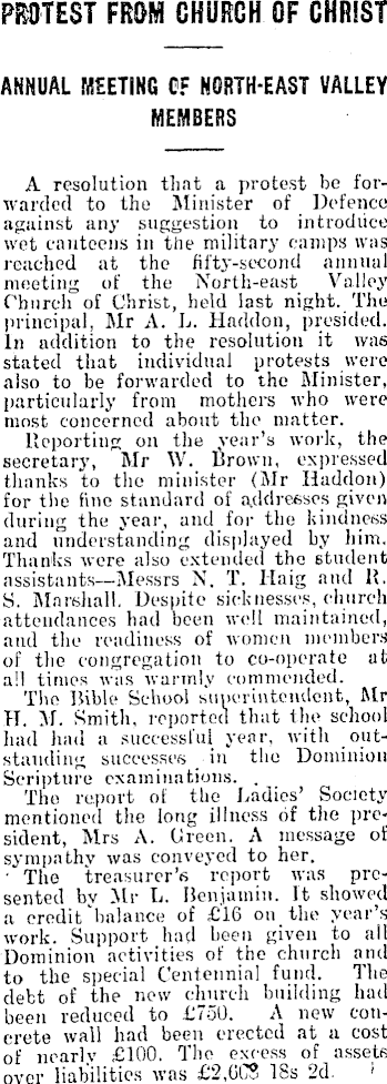 PROTEST FROM CHURCH OF CHRIST ANNUAL MEETING CF NORTH-EAST VALLEY MEMBERS A resolution that a protest be forwarded to the Minister of Defence against any suggestion to introduce wet canteens in the military camps was reached at the fifty-second annual meeting of the North-east Valley Church of Christ, held last night. The principal, Mr A. L. Haddon, presided. In addition to the resolution it was stated that individual protests were also to be forwarded to the Minister, particularly from mothers who were most concerned about the matter. Reporting on the year’s work, the secretary, Mr W. Brown, expressed thanks to the minister (Mr Haddon) for the fine standard of addresses given during the year, and for the kindness and understanding displayed by him. Thanks were also extended the student assistants—Messrs N. T. Haig and R. S. Marshall, Despite sicknesses, church attendances had been well maintained, and the readiness of women members of the congregation to co-operate at all times was warmly commended. The Bible School superintendent, Mr H. M. Smith, reported that the school had had a successful year, with outstanding successes _in the Dominion Scripture examinations. . The report of the Ladies’ Society mentioned the long illness of the president, Mrs A. Green. A message of sympathy was conveyed to her. ■ The treasurer’s report was presented by Mr L. Benjamin. It showed a credit "balance of £l6 on the year’s work. Support had been given to all Dominion activities of the church and to the special Centennial fund. The debt of the now church building had been reduced to £750. A new concrete wall had been erected at a cost of nearly £IOO. The excess of assets over liabilities was £2,6C8 18s 2d. '