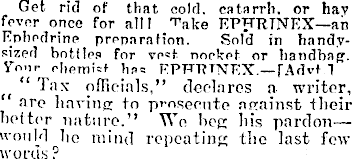 Get rid of that cold, catarrh, or hay fever once for alii /Take KPHRTNKX—an Pnhedrine preparation. Sold in handysized bntiiea for ve«t nochet or handbag. Vopp eiiemi=t baa EPTTRTNPX.—fAdvt 1 Tax officials,” declares a writer, arc haring to prosecute against their bolter nature.” Wo hog his pardon—would ho mind repeating the last few words ?