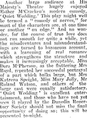 Another large audience at His Majesty’s Theatre hugely enjoyed Esther M'Cracken’fi modern comedy, ‘Quiet Wedding.’ This play might well be termed a “ comedy of nerves,” for most of the characters are, at one time or another “ on edge.” And no wonder, for the course of true love docs not run smooth for quite a while, yet the misadventures and misunderstandings are turned to humorous account, with a leavening of real romance which strengthens the structure and makes it increasingly acceptable. Miss Dora MTherson, as the fluttering Mrs Boyd, repeated her successful portrayal of a, part which bulks large, hut Mrs Katrena Speight, Miss Mary Jolly, Mr Roland Watson, and others of the largo, cast were equally satisfactory. 1 Quiet Wedding ’ is excellent entertainment, and those who hare not yet seen it played by the Dunedin Repertory Society should .not miss the final opportunity of doing so; this will bo presented fn-night.