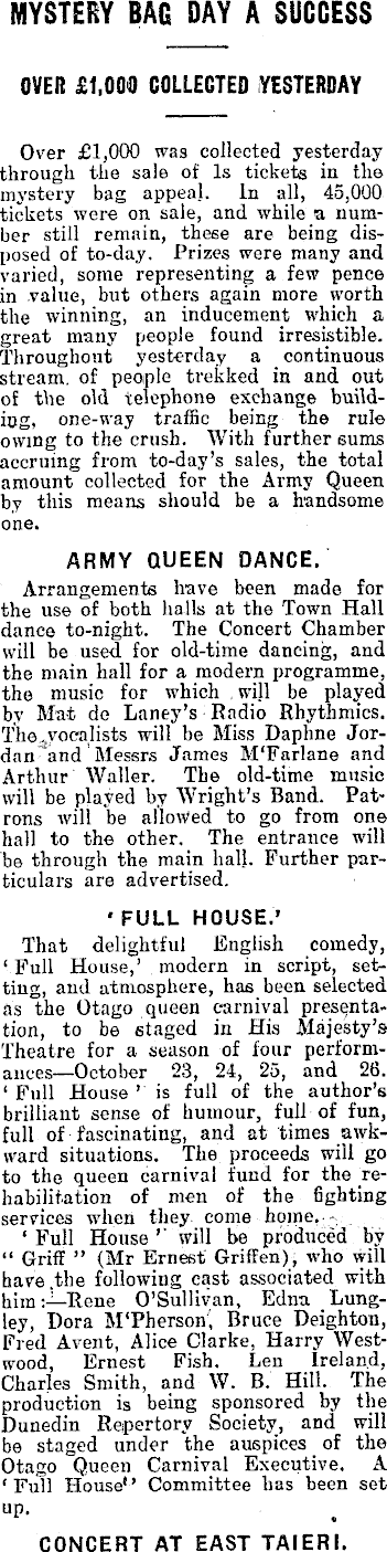 MYSTERY BAG DAY A SUCCESS OVER £I,OOO COLLECTED YESTERDAY Over £I,OOO was collected yesterday through the sale of Is tickets in the mystery bag appeal. In all, 45,000 tickets were on sale, and while a number still remain, these are being disposed of to-day. Prizes were many and varied, some representing a few pence in value, but others again more worth the winning, an inducement which a great many people found irresistible. Throughout yesterday a continuous stream, of people trekked in and out of the old telephone exchange building, one-way traffic being the rule owing to the crush. With further sums accruing from to-day’s sales, the total amount collected for the Army Queen by this means should be a handsome one. ARMY QUEEN DANCE. Arrangements have been made for the use of both halls at the Town Hall dance to-night. The Concert Chamber will be used for old-time dancing, and the main hall for a modern programme, the music for which , will be played by Mat do Laney’s Radio Rhythmics. The,.vocalists will be Miss Daphne Jordan and Messrs James M'Farlane and Arthur Waller. The old-time music will be played by Wright’s Band. Patrons will be allowed to go from one hall to the other. The entrance will be through the main hall. Further particulars are advertised. ' FULL HOUSE.’ That delightful English comedy, ‘Full House,’ modern in script, setting, and atmosphere, has been selected as the Otago queen carnival presentation, to be staged in His Majesty’s Theatre for a season of four performances—October 23, 24, 25, and 26. ‘ Full House ’ is full of the author’s brilliant sense of humour, full of fun, full of fascinating, and at times awkward situations. The proceeds will go to the queen carnival fund for the rehabilitation of men of the fighting services when they come home, - ‘ Full House ’’ will be produced by “ Griff ” (Mr Ernest Griffen); who will have .the following east associated with himßene O’Sullivan, Edna _ Lungley, Dora MTherson, Bruce Deighton, Fred Avent, Alice Clarke, Harry Westwood, Ernest Fish. Len Ireland, Charles Smith, and W. B. Hill. The production is being sponsored by the Dunedin Repertory Society, and will be staged under the auspices of the Otago Queen Carnival Executive. A ‘ Full House* ’ Committee has been set up. CONCERT AT EAST TAIERI.