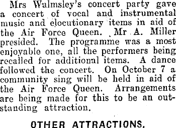 Mrs Walmsley’s concert party gave a concert of vocal and instrumental music and elocutionary items in aid of the Air Force Queen. .Mr A. Miller presided. The programme was a most enjoyable one, all the performers being recalled for additional items. A dance followed the concert. On October 7 a community sing will be held in aid of the Air Force Queen. Arrangements are being made for this to be an outstanding attraction. OTHER ATTRACTIONS.