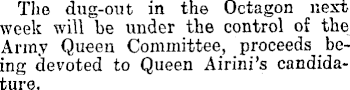 The dug-out in the Octagon next week will be under the control of the Army Queen Committee, proceeds being devoted to Queen Airini’s candidature.