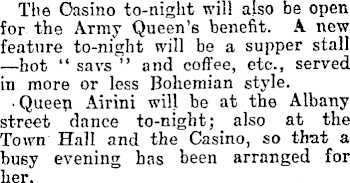The Casino to-night will also be open for the Army Queen’s benefit. A new feature to-night will be a supper stall —hot “ savs ” and coffee, etc., served in more or less Bohemian style. • Queen Airini will be at the Albany street dance to-night; also at the Town Hall and the Casino, so that a busy evening has been arranged for her.