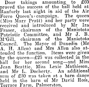 Door takings amounting, to £6O proved the success of the ball held at Ranfurly last night in aid of the Air Force Queen’s * campaign. The queen (Miss Mary Pratt) and her party were received and introduced by Mr Ira Fraser, chairman of the Maniototo Patriotic Committee, and Mr J. B. M'Grill, chairman of the Maniototo Council. The Mayor of Dunedin (Mr A. H. Allen) and Mrs Allen also attended the function. Items were given by the queen—£2s was collected in the hall for her second song—and Miss Jean Beattie, Miss Lexie Mathieson, and Mr L. Docherty. An additional sum of £3O was taken at a barn dance held in the barn of Mr David Iloss, Terrace Farm, Palmerston.