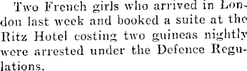 Two French girls who arrived in London last week and hooked a suite at the Ritz Hotel costing two guineas nightly were arrested under the Defence Regulations.