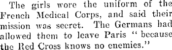 The girls wore the uniform of the French Medical Corps, and said their mission was secret. The Germans had .allowed them to leave Paris “ because the Red Cross knows no enemies.”