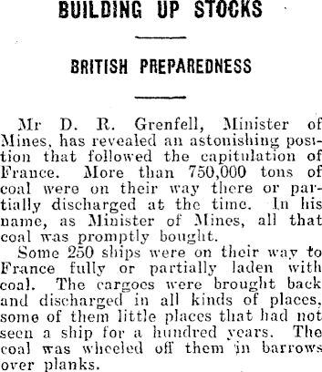 BUILDING UP STOCKS BRITISH PREPAREDNESS Mr D. R. Grenfell, Minister of Mines, has revealed an astonishing position that followed the capitulation of France. More than 750,000 tons of coal were on their way there or partially discharged at the time. In his name, as Minister of Mines, all that coal was promptly bought. Some 250 ships were on their way to France fully or partially laden with coal. The cargoes were brought back and discharged in all kinds of places, some of them little places that had not seen a ship for a hundred years. The coal was wheeled off them jn barrows over planks.