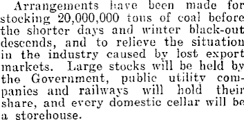Arrangements have been made for stocking 20,000,000 tons of coal before the shorter days and winter black-out descends, and to relieve the situation in the industry caused by lost export markets. Large stocks will be held by the Government, public utility companies and railways will hold their share, and every domestic cellar will be a storehouse.