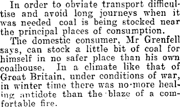 In order to obviate transport diffioultise and avoid long journeys when it was needed coal is being stocked near the principal places of consumption. The domestic consumer, Mr Grenfell says, can stock a little bit of coal for himself in no safer place than his own coalhouse. In a climate like that of Great Britain, under conditions of war, in winter time there was no-more healing antidote than the blaze of a comfortable fire.