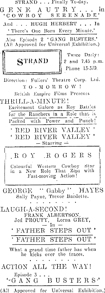 STRAND . . . Finally To-day. G E N E AUTRY... in ‘cOWBOYSE R E N A D E ’ And . . . HUGH HERBERT ... In ‘ There’s One Born Every Minnie.’ Also Episode 2 ‘GANG BUSTERS.’ (All Approved for Universal Exhibition.) Twice Daily: 2 and 7.45 p.m. Phone 13-3 D Direction: Fullers’ Theatre Corp. Etd. T O - II O R R O \V ! British Empire Films Presents THRILL-A-MIN UTE ! Excitement Galore as Roy Battles for the Ranchers in a Role dial is. Packed with Power and Punch! ‘ RED RIVER VALLEY ’ ‘ RED RIVER VALLEY ’ Starring i “ .R 0 Y .R OGE R S Colourful Western Cowboy Star in a New Role That Zips with Fast-moving Action ! GEORGE “Gabby”. HAYES Sally Payne, Trevor Bardette. LAUGH-A-SECOND! FRANK ALBERTSON. Jed PROUTY, Lorna GREY, - ‘ FATHER STEPS OUT ’ ‘ FATTIER STEPS OUT ’ gTRAND What a grand time father has when he kicks over the (races. ACTION ALL THE WAY! Episode 3 . . . ‘“GANG BUSTERS’’ (All Approved for Universal Exhibition.)