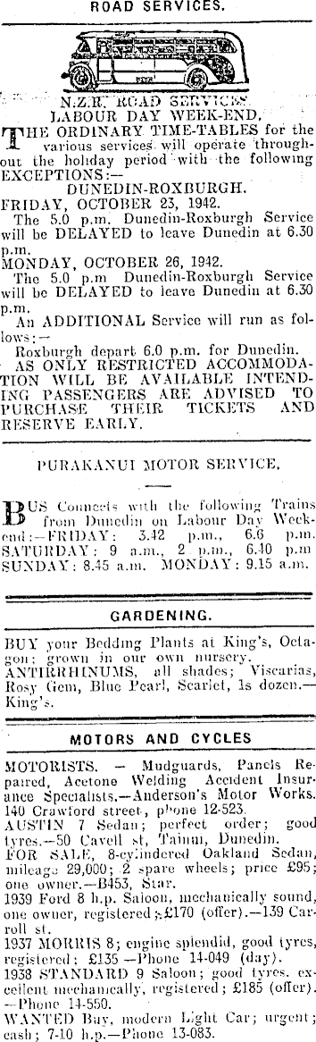 ROAD SERVICES. '■- NiZißriutAD services, LABOUR DAY WEEK-END. THE ORDINARY TIME-TABLES for the various services, will operate throughout the holiday period with the following EXCEPTIONS:-DUNEDIN-ROXBURGH. FRIDAY, OCTOBER 23, 1942. The 5.0 p.m. Dunedin-Roxburgh Service will be DELAYED to leave Dunedin at 6.30 p.m. MONDAY, OCTOBER 26. 1942. The 5.0 p.m Dunedin-Roxburgh Service will bo DELAYED to leave Dunedin at 6.30 An ADDITIONAL Service will run as follows ; Roxburgh depart 6.0 p.m. for Dunedin. AS ONLY RESTRICTED ACCOMMODATION WILL BE AVAILABLE INTENDING PASSENGERS ARE ADVISED TO PURCHASE THEIR TICKETS AND RESERVE EARLY, PURAKANUI MOTOR SERVICE. BUS Connects with the following Trains from Dunedin on Labour Day Weekend FRIDAY: 3.42 p.m., 6.6 p.m. SATURDAY; 9 n.m., 2. n.m., 6.40 p.m SUNDAY; 8.45 a.m. MONDAY; 9.15 a.m. GARDENING. BUY your Bedding Plants at King’s, Octagon ; grown in our own nursery. ANTIRRHINUMS, oil shades; Viscarias, Rosy Gem, Bine Pearl, Scarlet, Is dozen King’s. MOTORS AND CYCLES MOTORISTS. Mudguards, Panels Repaired, Acetone Welding Accident Insurance Specialists,—Anderson’s Motor Works. 140 Crawford street, pl’one 12-523. AUSTIN 7 Sedan; perfect order; good tyres,—so Cavcll st, Tainni, Dunedin. i'OR SALE, S-cylindcrod Oakland Sedan, mileage 29,000; 2 spare wheels; price £95; one owner.— 8453, Star. 1939 Ford 8 h.p. Saloon, mechanically sound, one owner, registered ;-.£170 (offer). —139 Carroll st. 1937 MORRIS 8; engine splendid, good tyres, registered; £135-Phone 14-049 (day). 1938 STANDARD 9 Saloon; good tyres, excellent mechanically', registered; £lB5 (offer). -Phone 14-550. WANTED Buy, modern Light Car; urgent; easli; 7-10 h.p.—Phone 13-085.