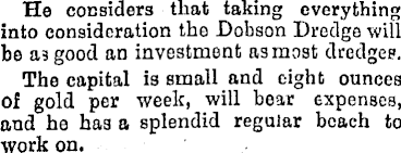 He considers that taking everything into consideration tho Dobson Dredge will be as good an investment as most dredges. The capital is small and eight ounces of gold per week, will bear expenses, and he has a splendid regular beach to work on.